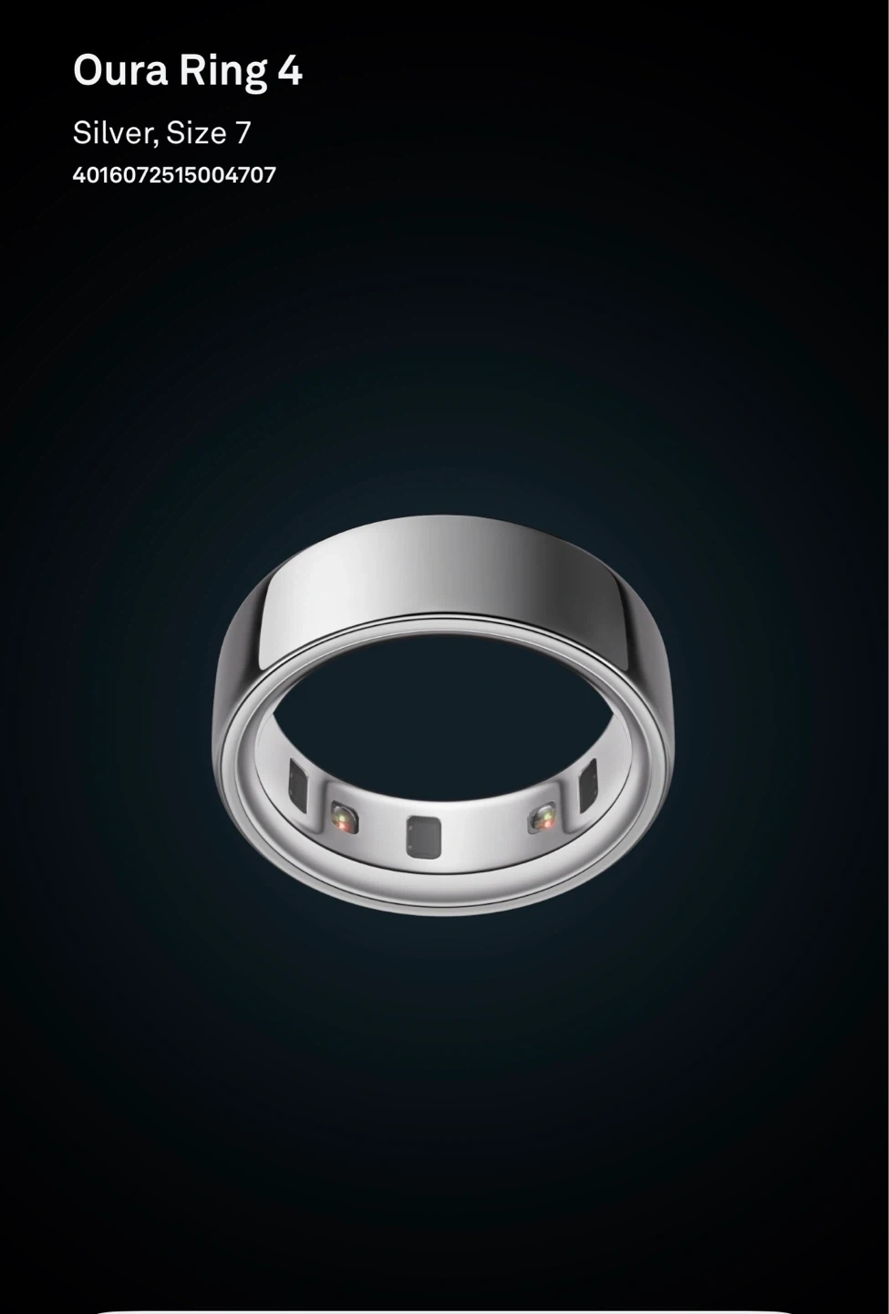 Oura Ring 4 in silver, size 7. Measures sleep, activity, and readiness. It's a smart ring with sensors for health tracking.