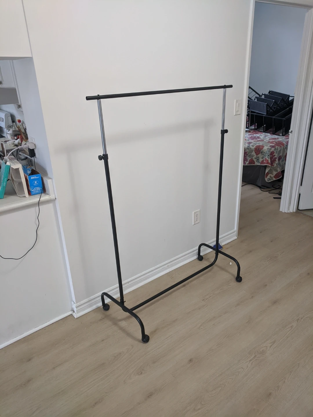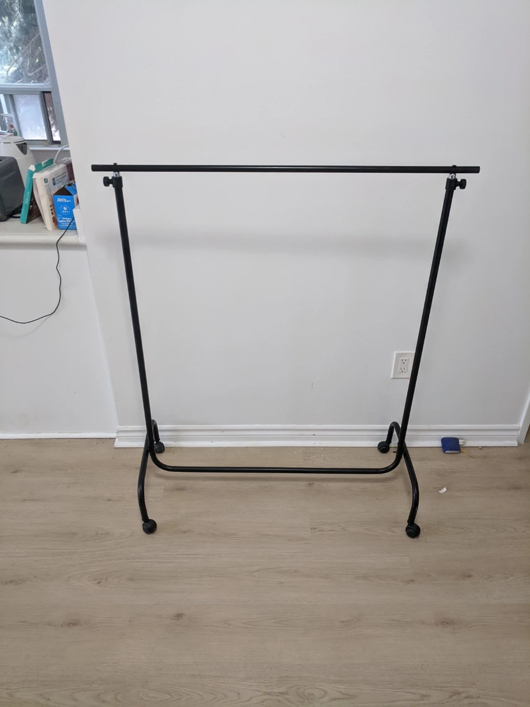 This rolling garment rack offers ample space for hanging clothes. It features an adjustable height and wheels for easy transport and stability. Black metal frame and silver bars.