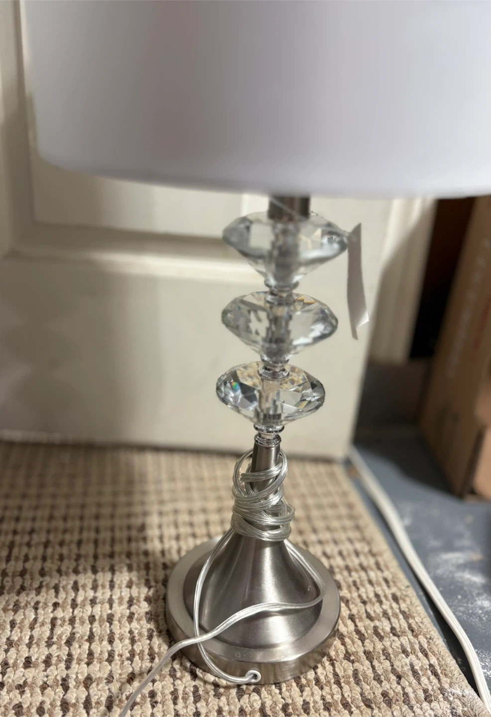 This pair of table lamps features a brushed nickel base with a silver cord accent and decorative crystal beads. The white drum shades complete the look. It's ideal for adding a touch of sparkle to your living room or bedroom! 2 feet tall each.