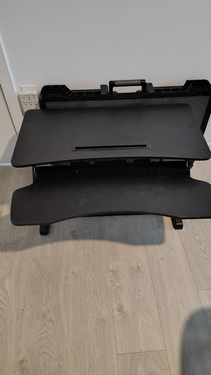 This is a black standing desk converter. It's adjustable to different heights. The top surface is for your monitor and the lower surface is for your keyboard and mouse.