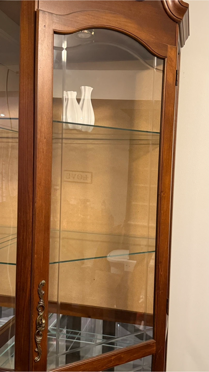 This beautiful curio cabinet is made of dark wood and features glass doors and shelves. It's perfect for displaying collectibles, china, or decorative items. The cabinet has multiple adjustable glass shelves. One side mirror is missing but easy to get replacement.