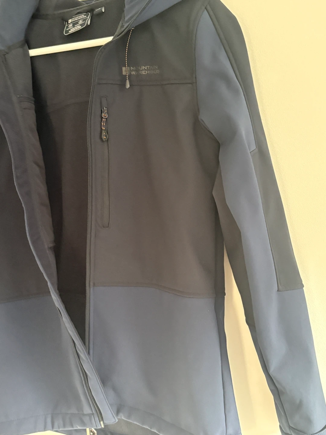 This Mountain Warehouse softshell jacket is a navy blue colour. It's a hooded jacket with a full zip and multiple pockets. Great for outdoor activities!
