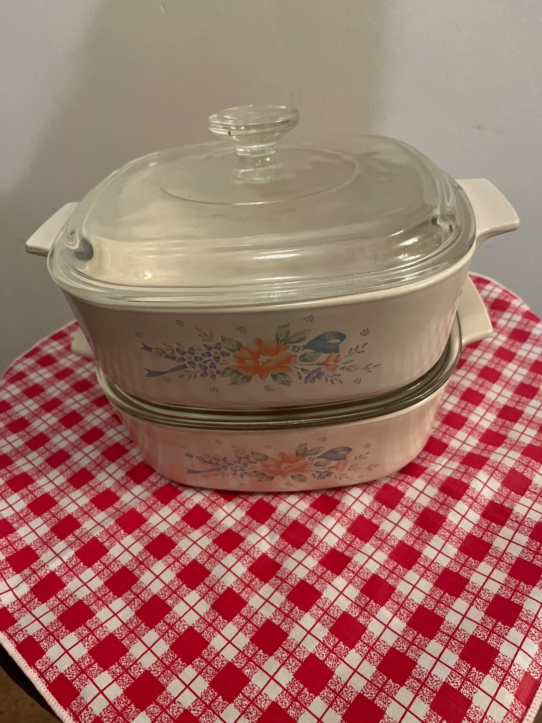 This is a vintage CorningWare casserole dish. It has a cream-coloured base with a floral pattern featuring birds and flowers. The dish comes with a clear glass lid. It's perfect for baking or serving.