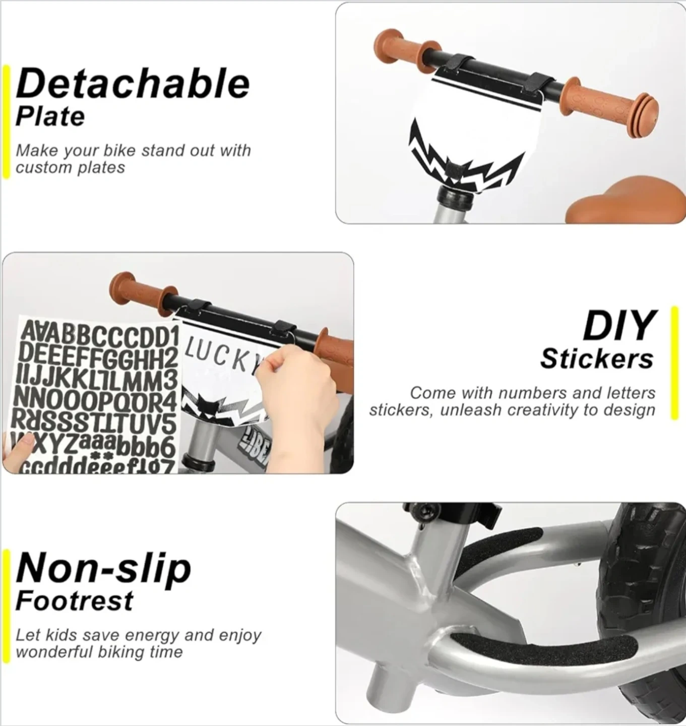 I'm selling a brand new Hiberry balance bike! It features a sturdy steel frame and anti-puncture tires, so kids can ride freely and safely on different surfaces. It has a detachable plate, and comes with DIY stickers to unleash creativity with design. The non-slip footrest lets kids save energy and enjoy wonderful biking time. The adjustable handlebar and seat let kids find the most comfortable riding position for their height. It helps boost energy, improve agility, and exercise muscles!