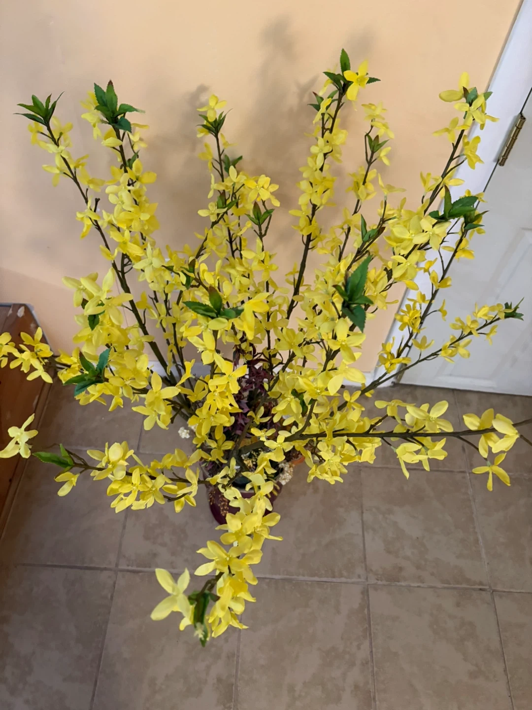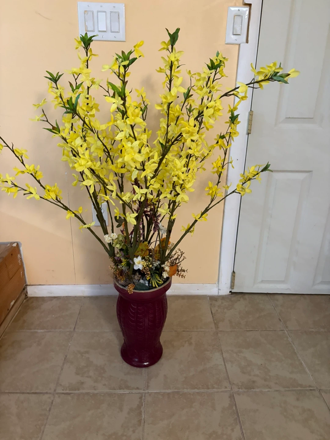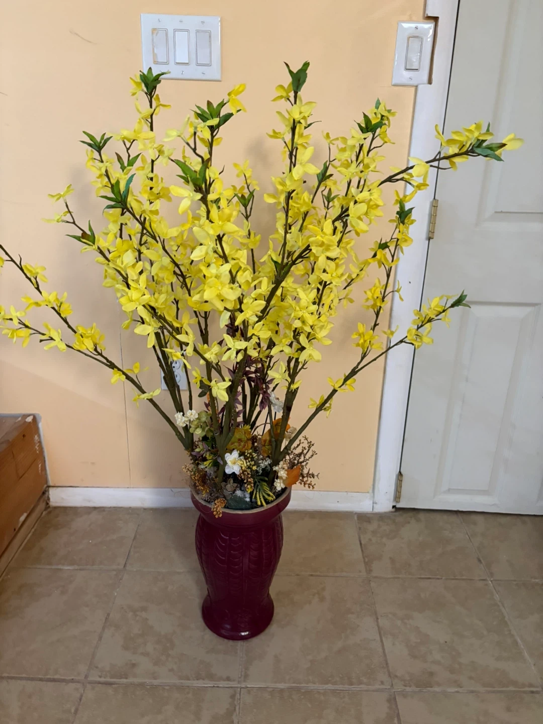 Artificial Yellow Forsythia Floral Arrangement in Burgundy Vase