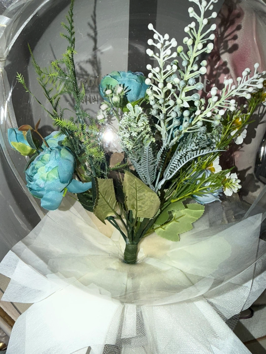 A beautiful bouquet of artificial teal, white, and green flowers, arranged in a clear sphere. It's tied with a white ribbon and tulle wrapping at the base. Perfect for home decor or as a gift!🥕