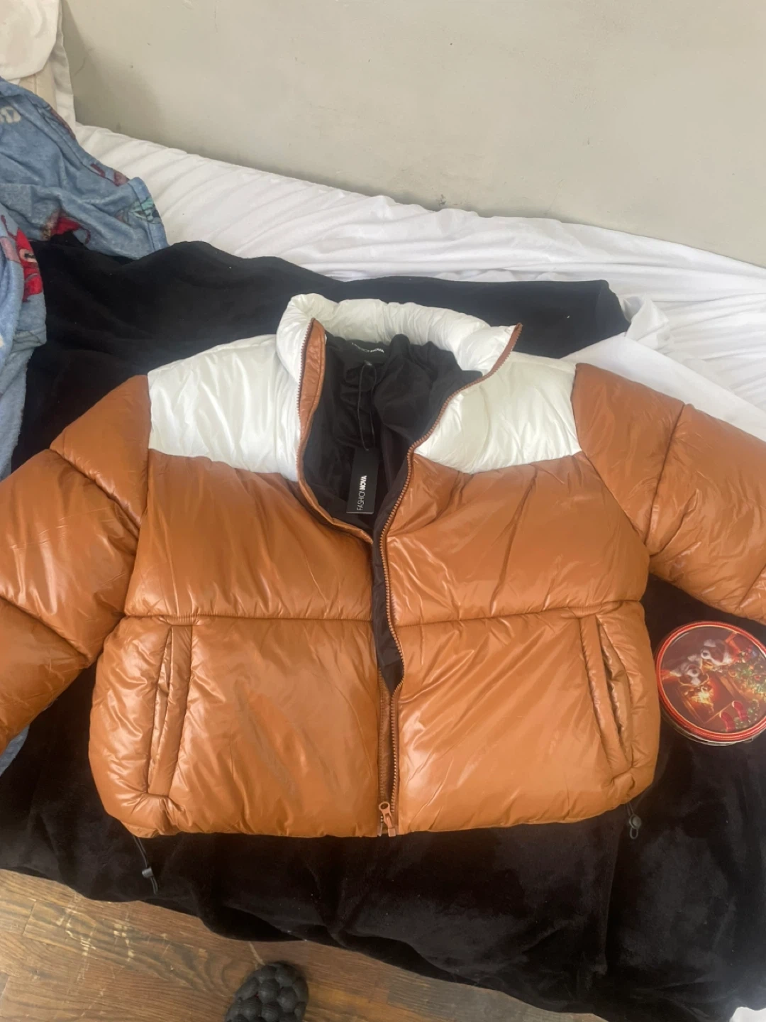Fashion Nova puffer jacket in a two-tone brown and white design. It's a stylish and warm outerwear piece. Features a zip-up front and pockets.