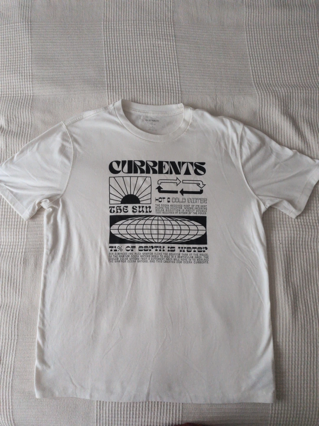 This white Old Navy t-shirt features a "Currents" graphic print about oceanography. It's made of cotton and is a size medium. This tee is great for casual wear and learning about Earth's water distribution!