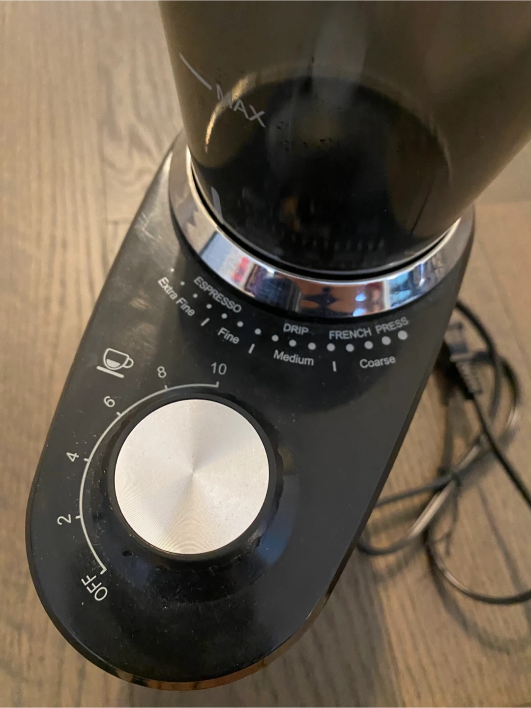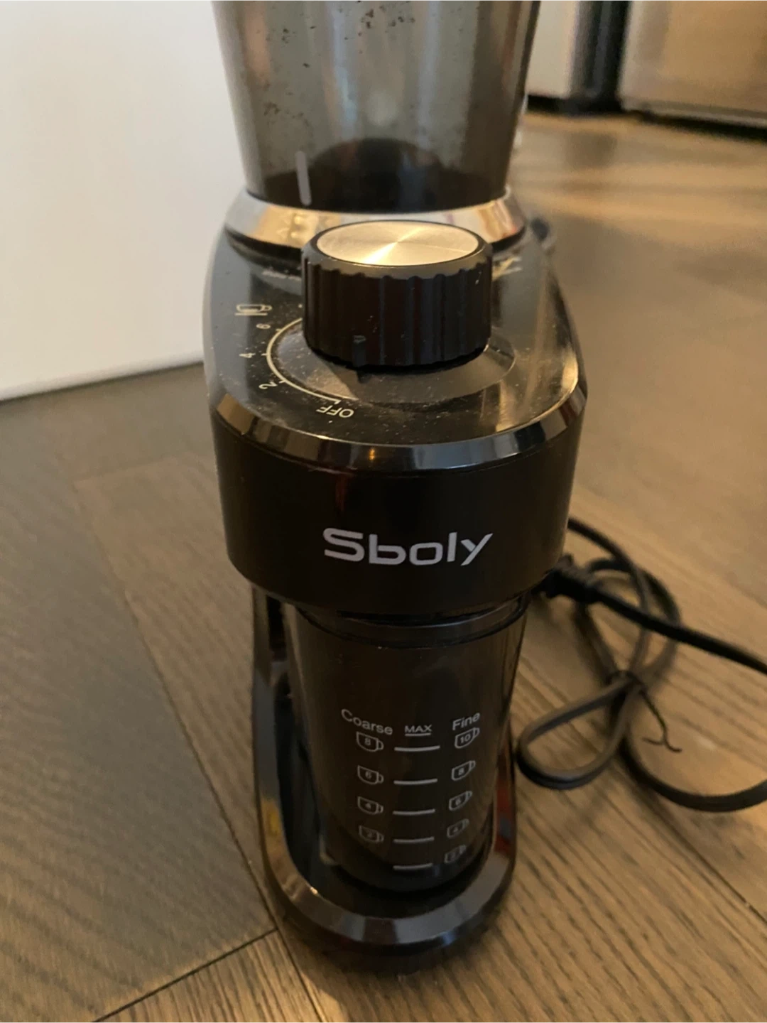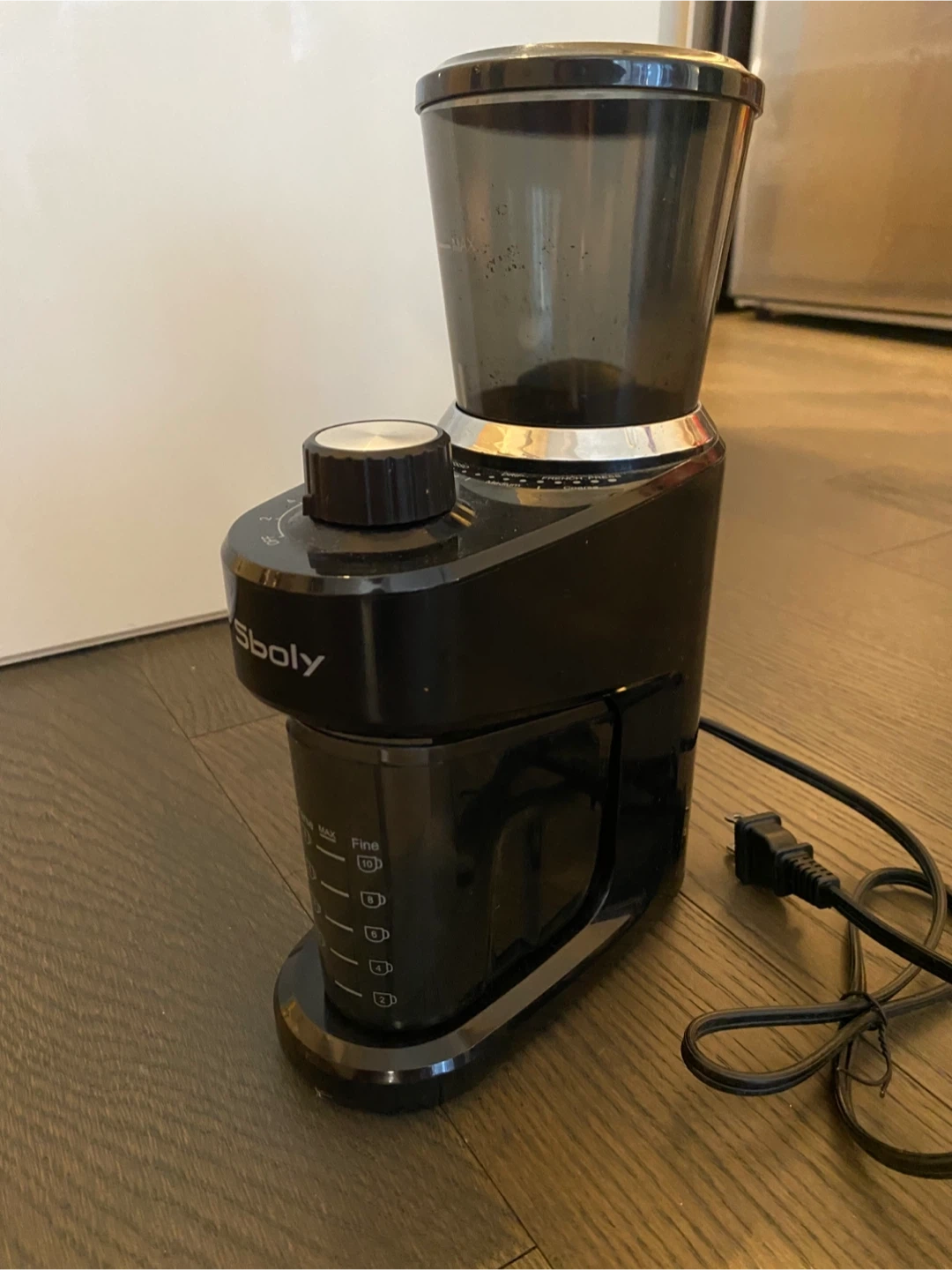 Selling a Sboly electric coffee grinder in black. It has settings for extra fine to coarse, perfect for espresso to French press. It's in great shape and ready to grind your favourite beans!