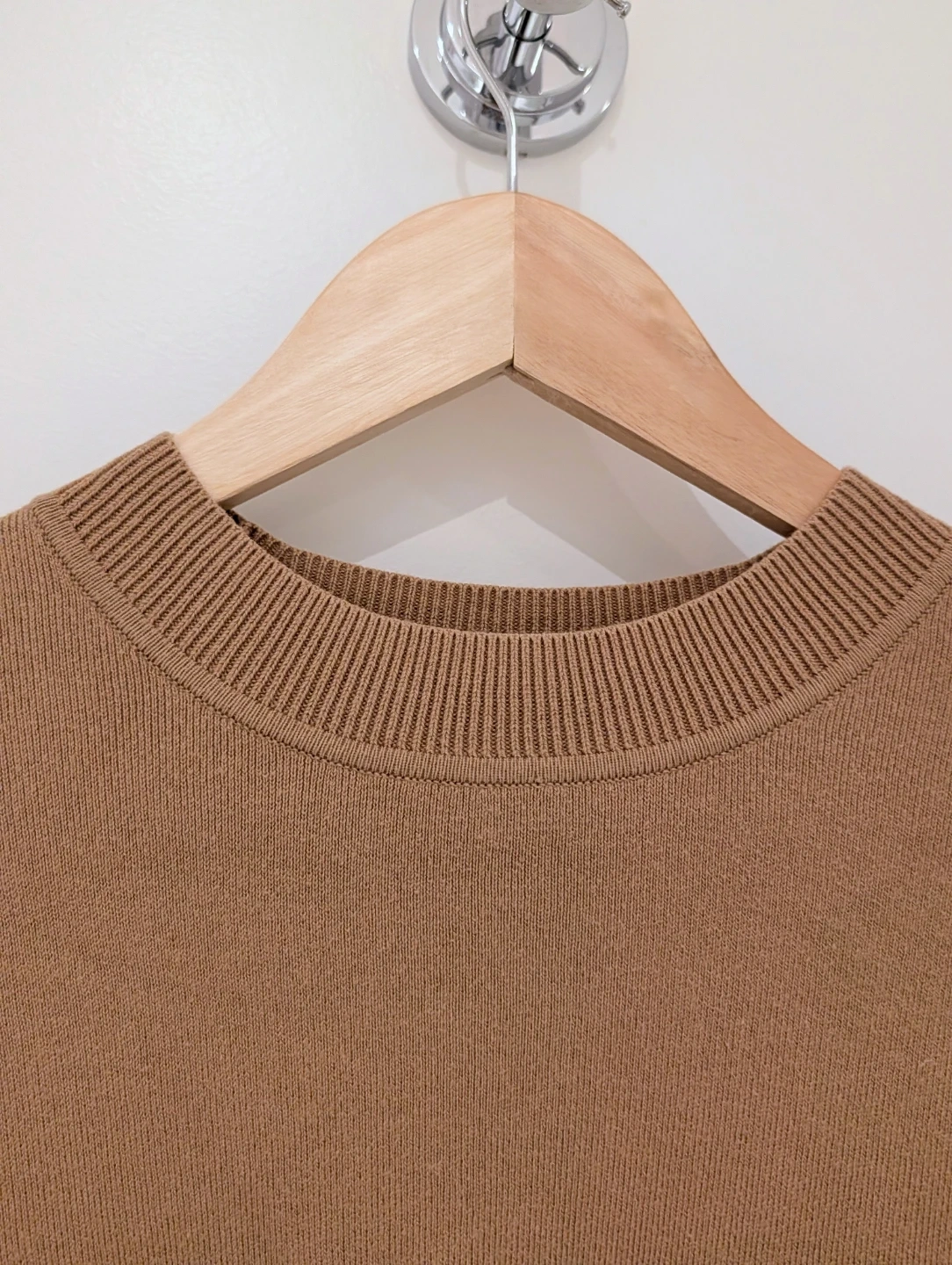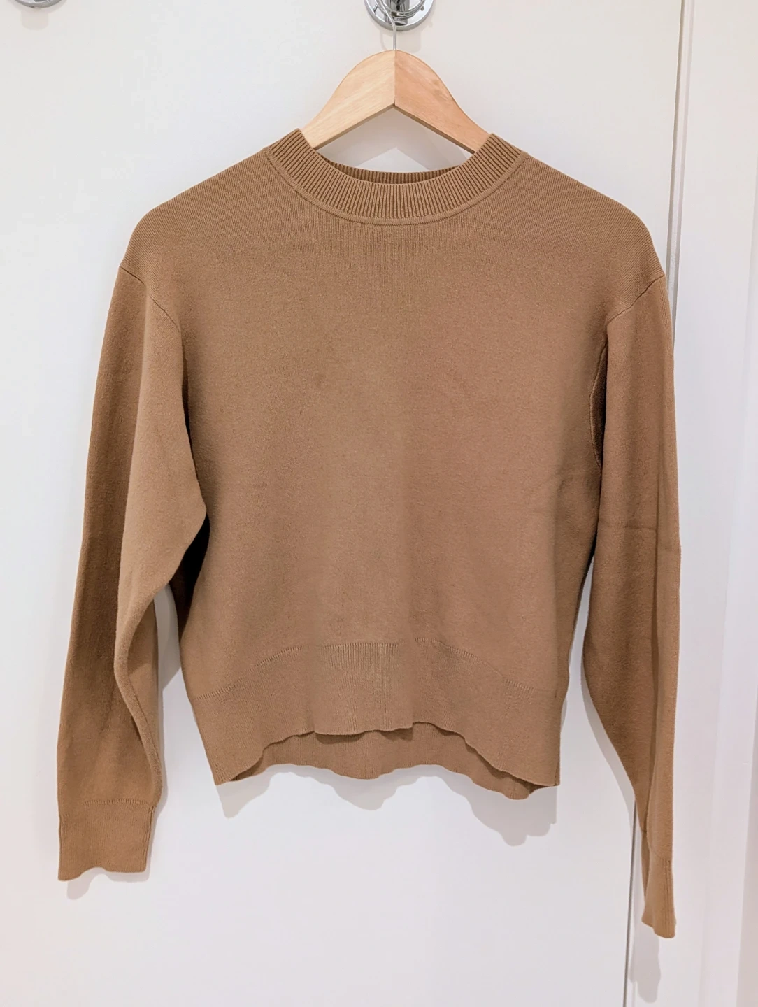 This UNIQLO crew neck sweater is made from 100% cotton. It's a classic tan colour and is a size S/P. Barely worn, in great condition. t's a great staple for layering or wearing on its own!