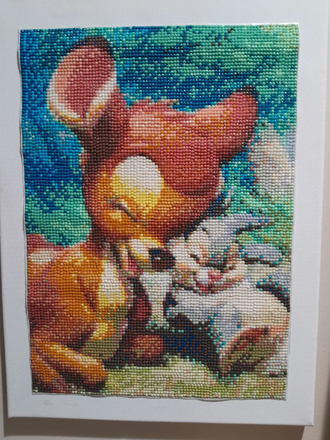 A completed diamond painting featuring Bambi and Thumper. It's crafted with colourful drills on a canvas. This piece would be great for a nursery or any Disney fan!