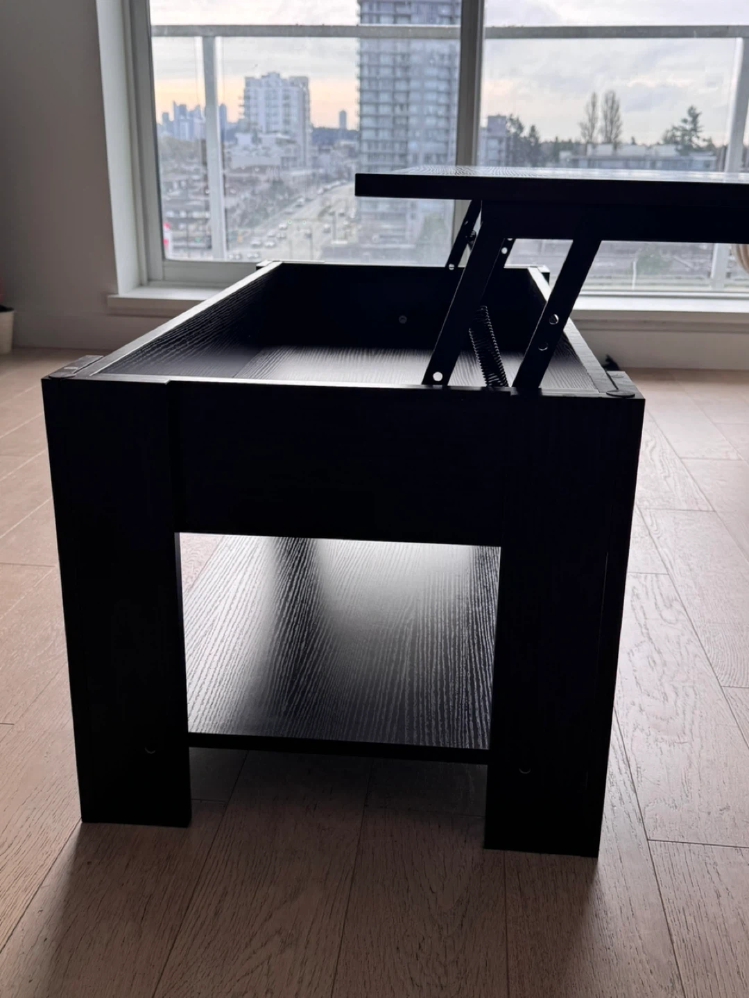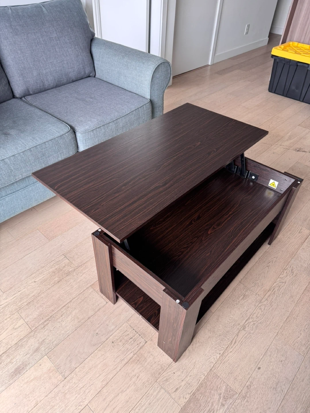 Dark wood finish lift-top coffee table with storage shelf. It has a lift-top mechanism for easy access to hidden storage. Great for small living spaces!