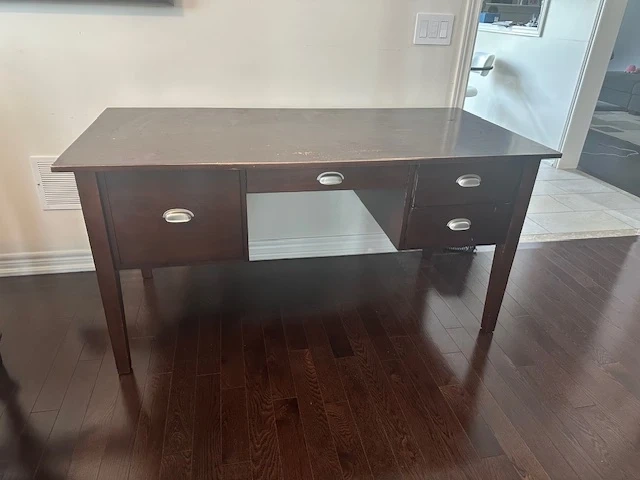 This is a dark wood desk with four drawers. It's a solid piece of furniture that offers good storage. It would be useful for a home office setup.