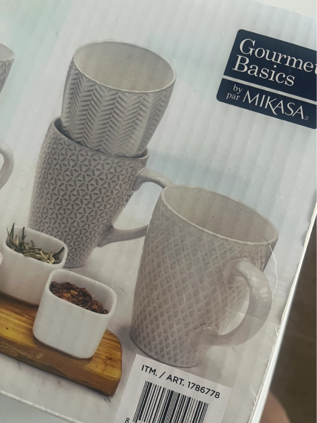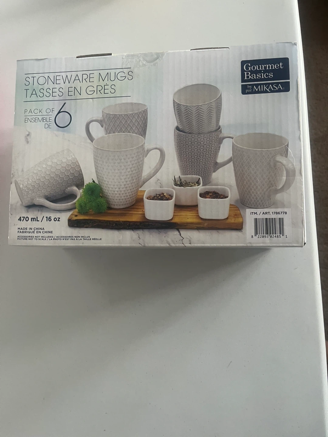 This is a pack of 6 stoneware mugs from Gourmet Basics by Mikasa. Each mug holds 470 ml / 16 oz. They're perfect for enjoying your favourite hot beverages.