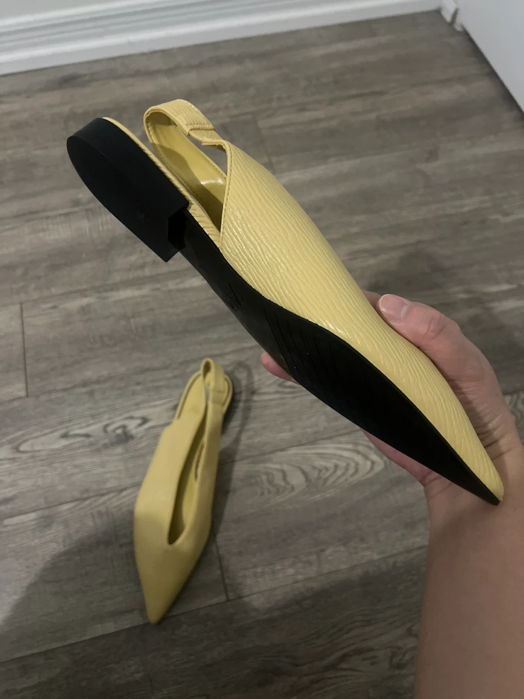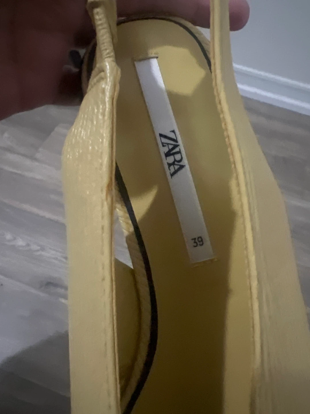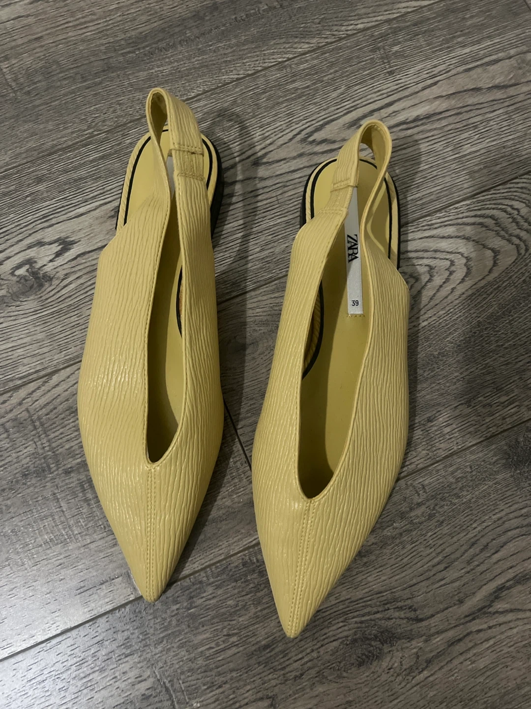 ZARA slingback flats in a light yellow colour. Features a pointed toe and a textured finish. Size 39.