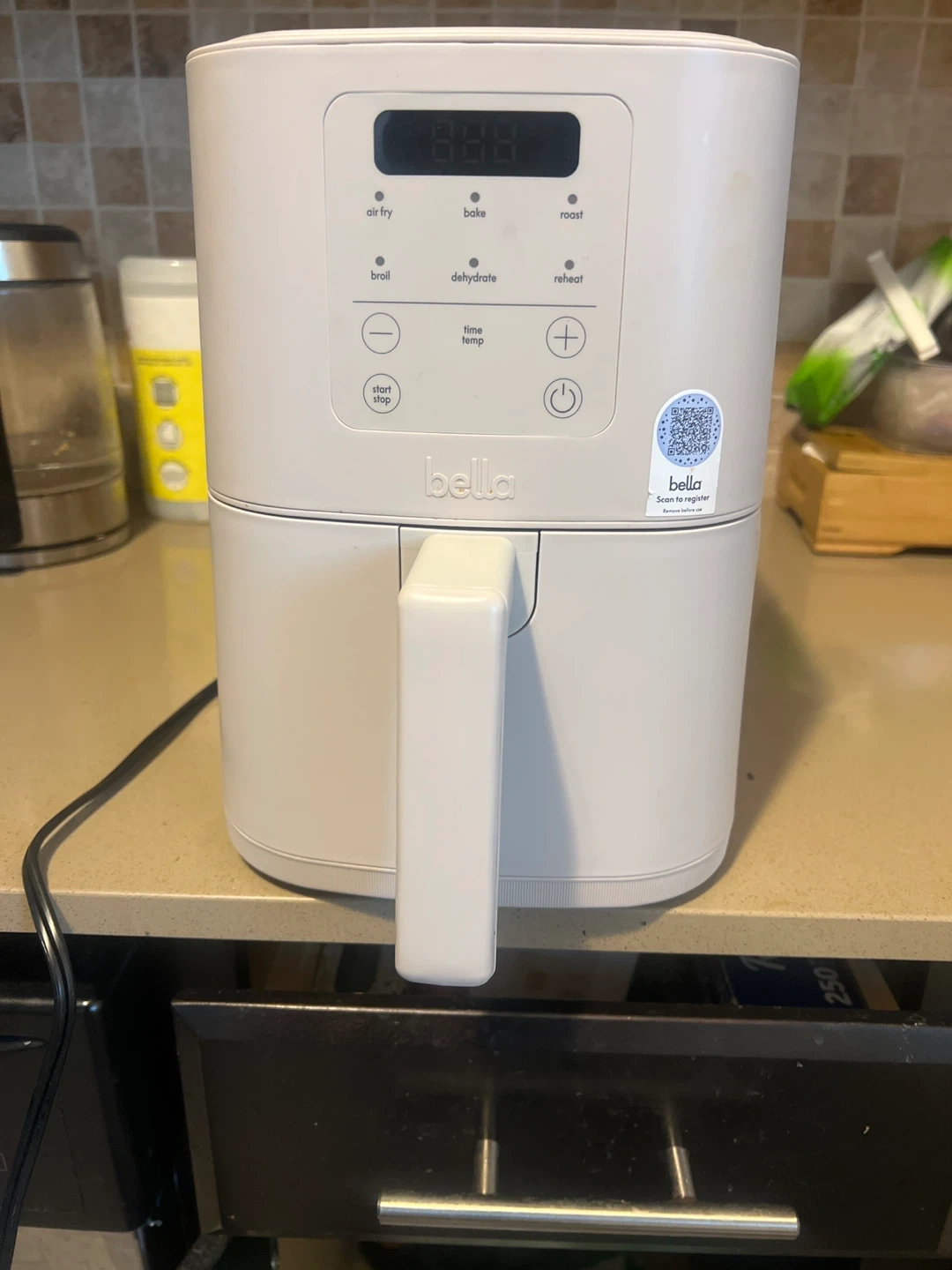 This Bella air fryer offers multiple cooking functions including air fry, bake, roast, broil, dehydrate, and reheat. It has controls for time and temperature adjustments. Great for quick meals!
