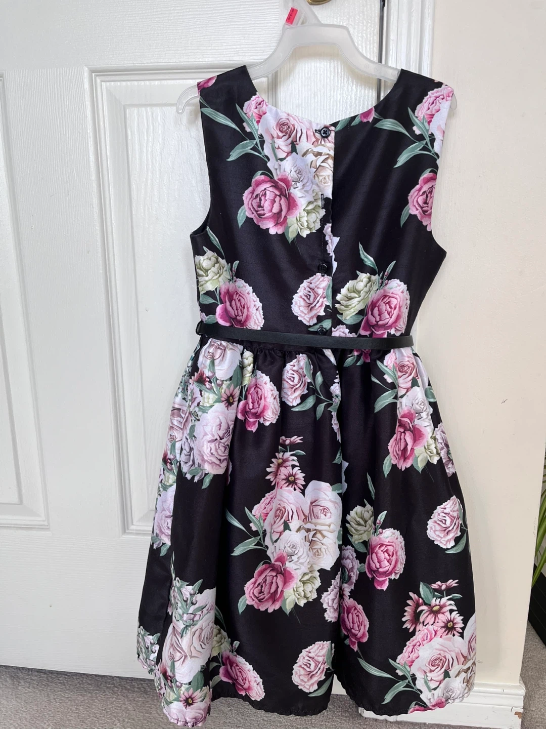 A beautiful dress for a girl 6-8 years old, with a floral print design! It features a black background with pink and white roses.