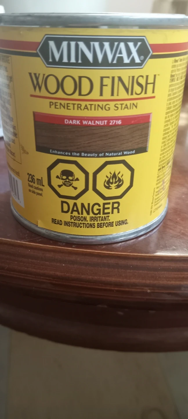 Minwax Wood Finish Penetrating Stain in Dark Walnut. Enhances the beauty of natural wood. 236 mL can. Read instructions before using.