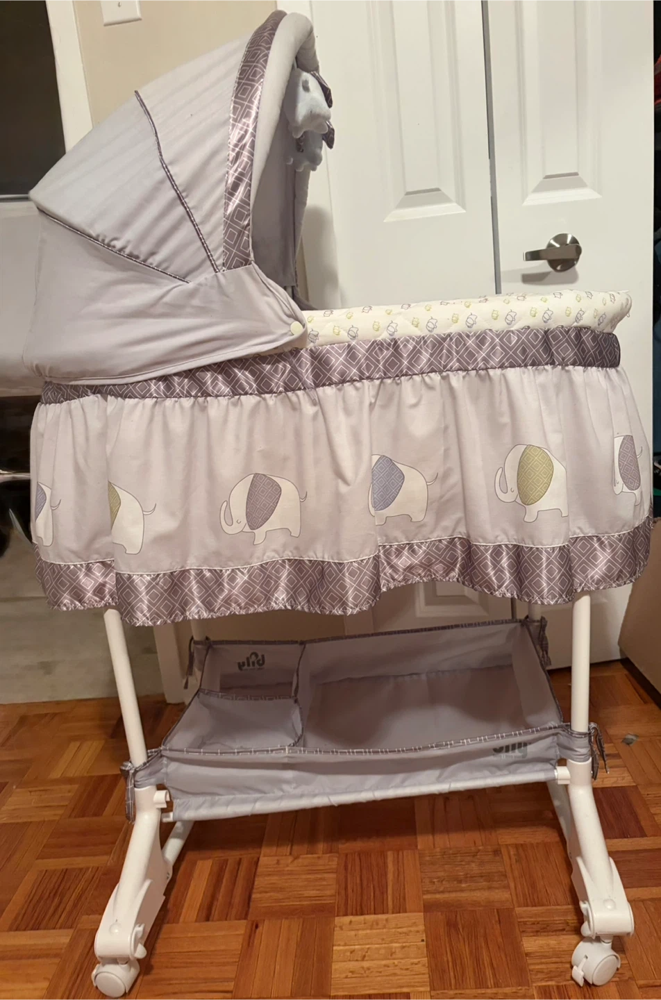 Selling a gently used bassinet featuring a cute elephant design! It's in great condition and perfect for newborns. It has a storage area underneath and a hood with hanging toys to keep baby entertained OBO
