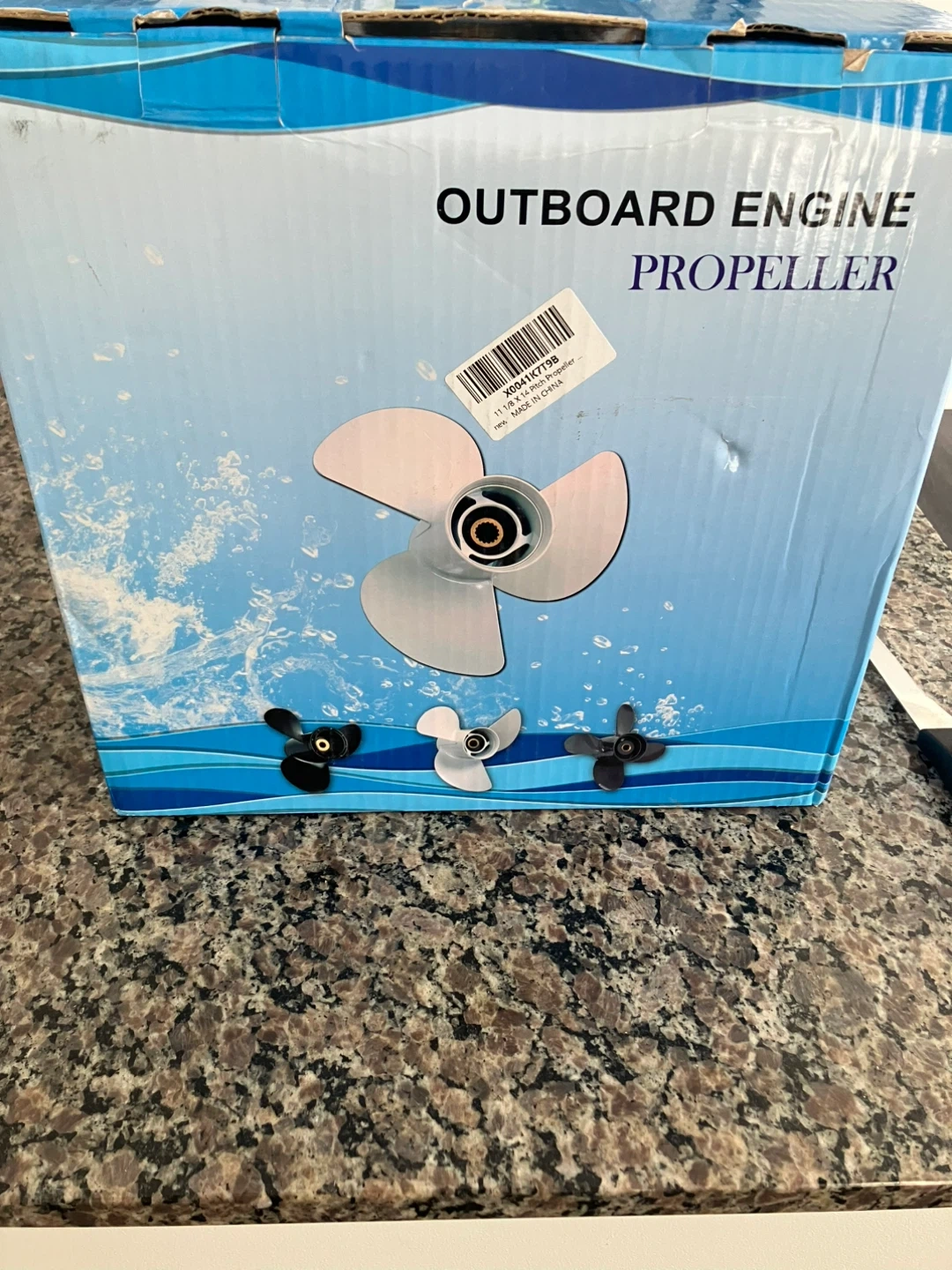 This is a new outboard engine propeller. It's a 11 1/8 x 14 pitch propeller, made in China. It comes in its original box. This propeller is suitable for outboard engines needing these specific dimensions.