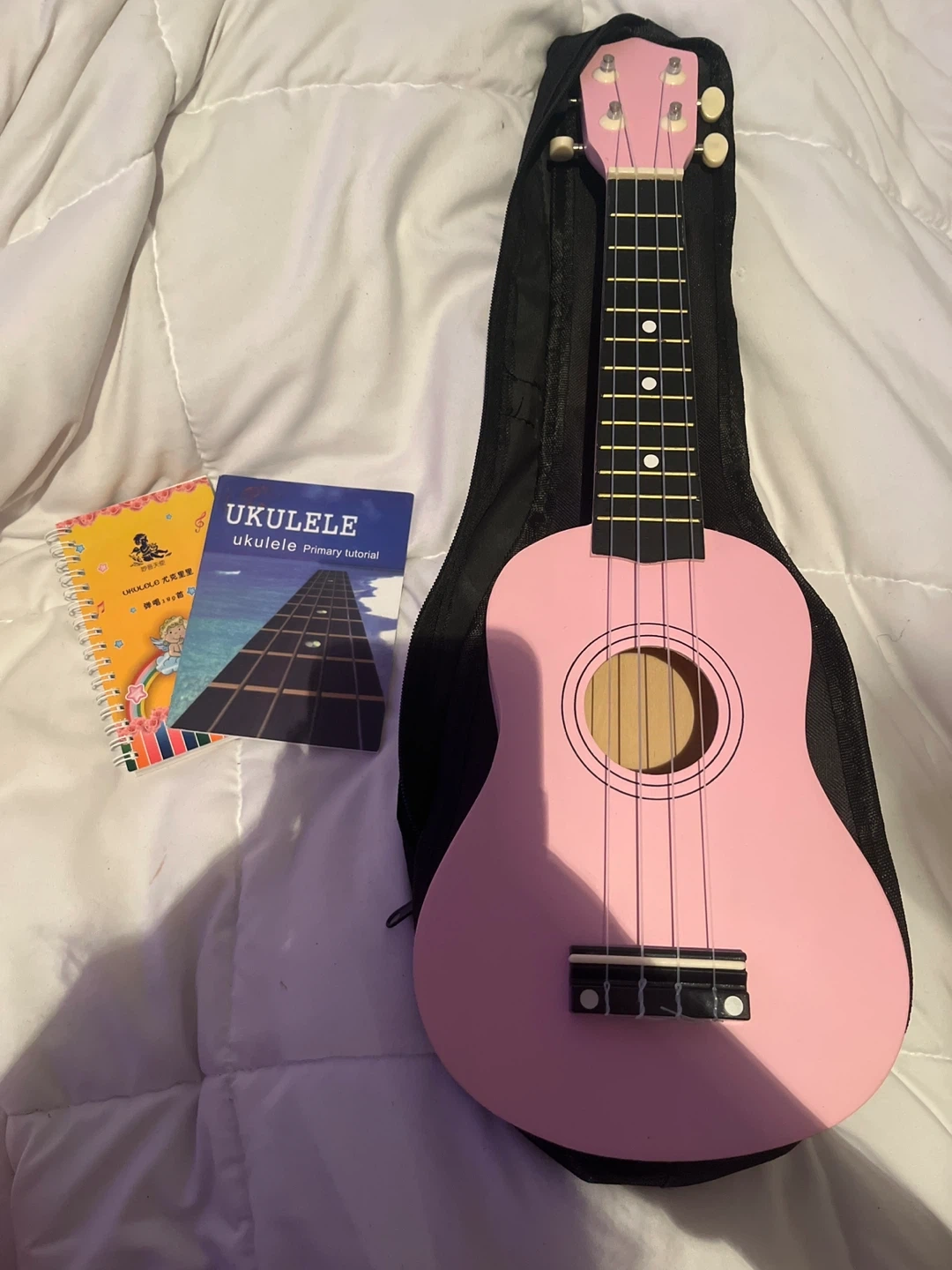 This is a pink ukulele that comes with a black gig bag for easy transport. It also includes two tutorial books, "UKULELE ukulele Primary tutorial" and another smaller notebook with illustrations. This set is perfect for beginners learning to play the ukulele!