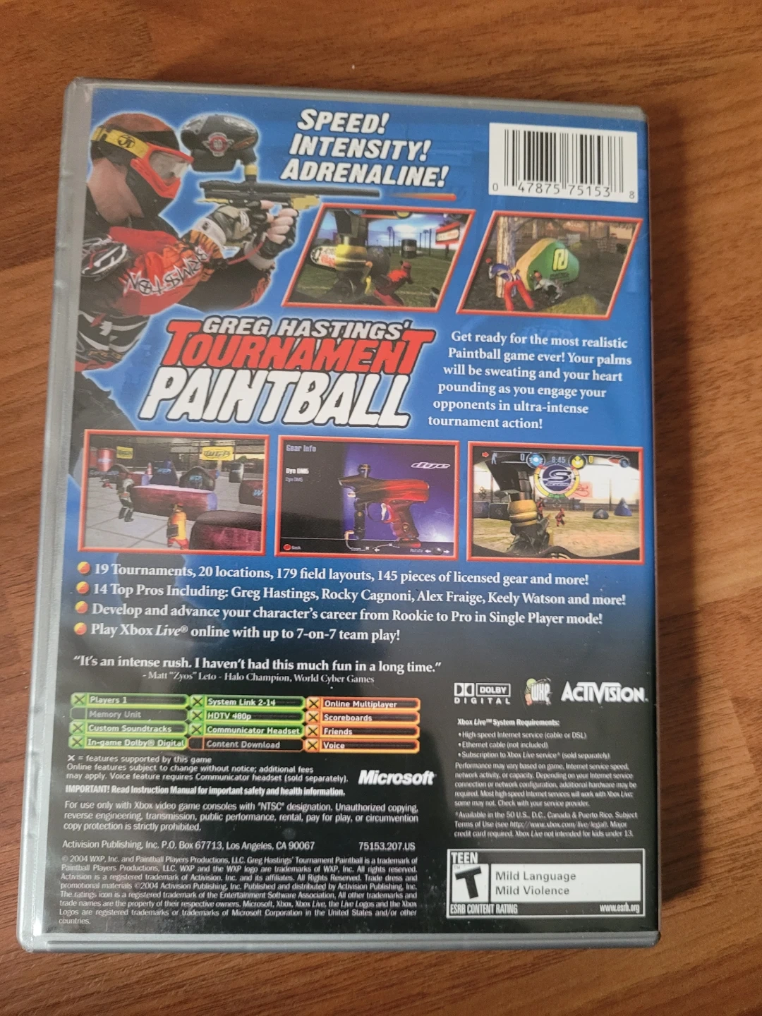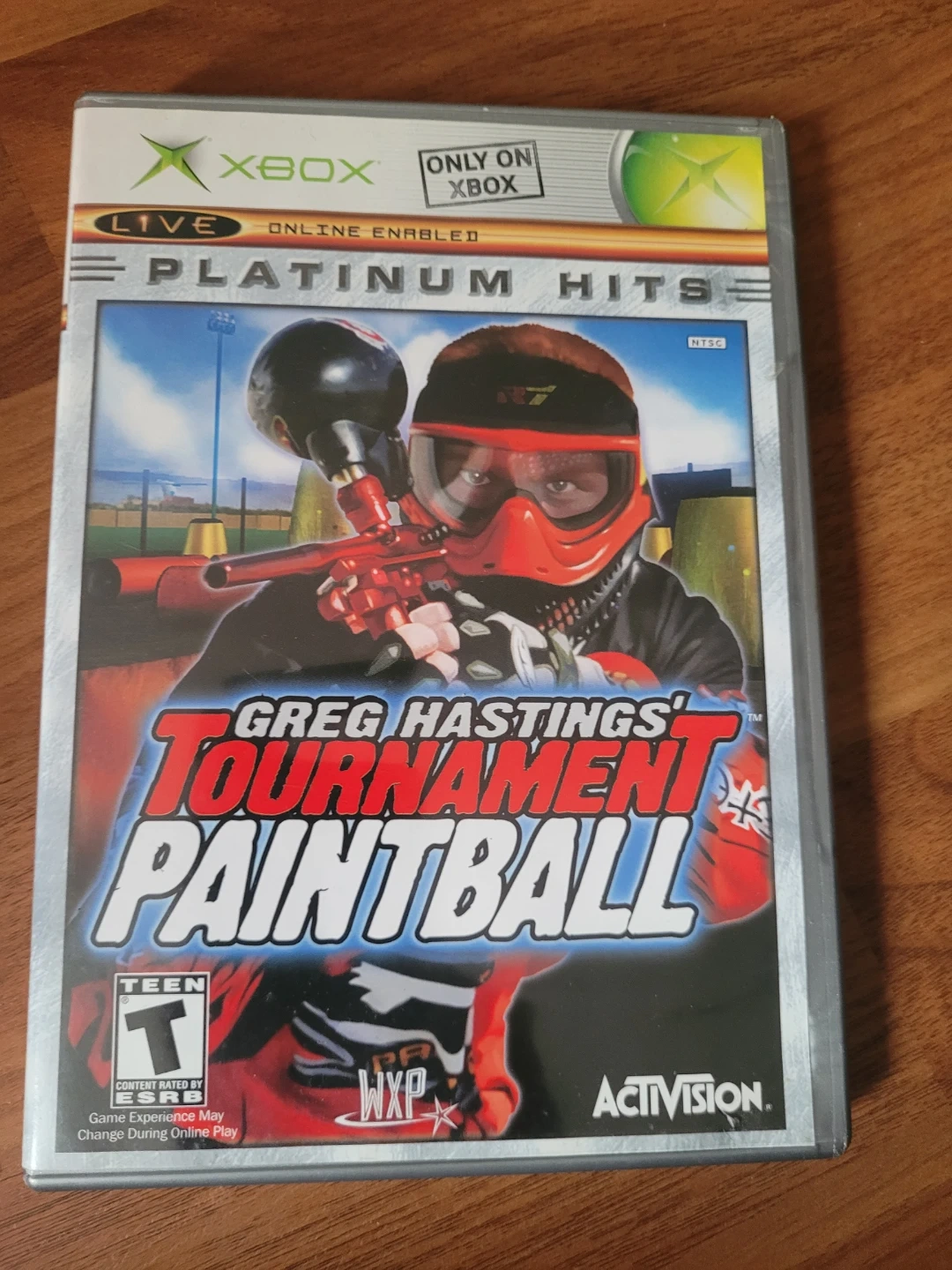 Intense Xbox game, Greg Hastings' Tournament Paintball Platinum Hits edition. Has 19 tournaments, 20 locations, 179 field layouts. Play as 1 of 14 pros or develop your own character. Original Xbox Live online play was a thing back then. Rated Teen for mild language and violence.