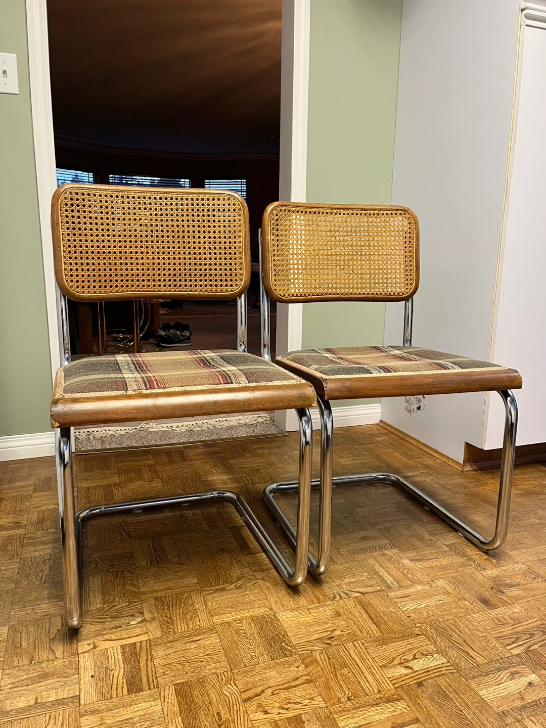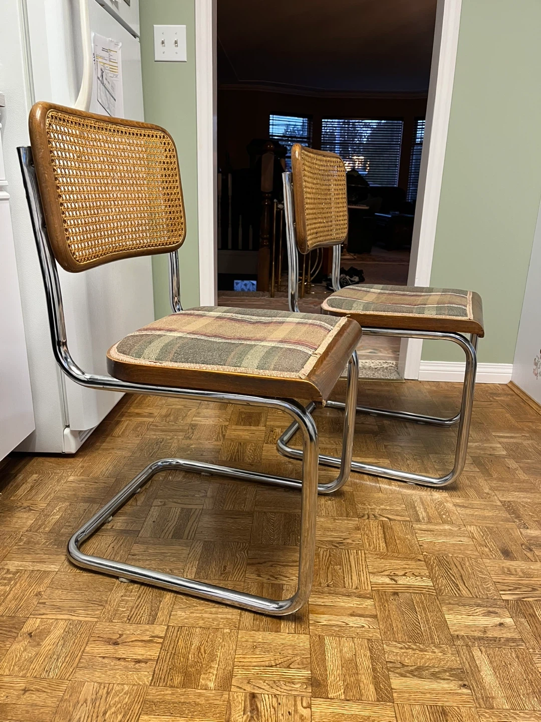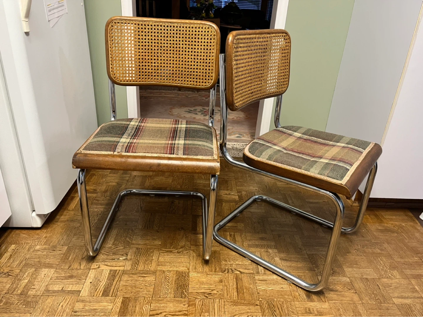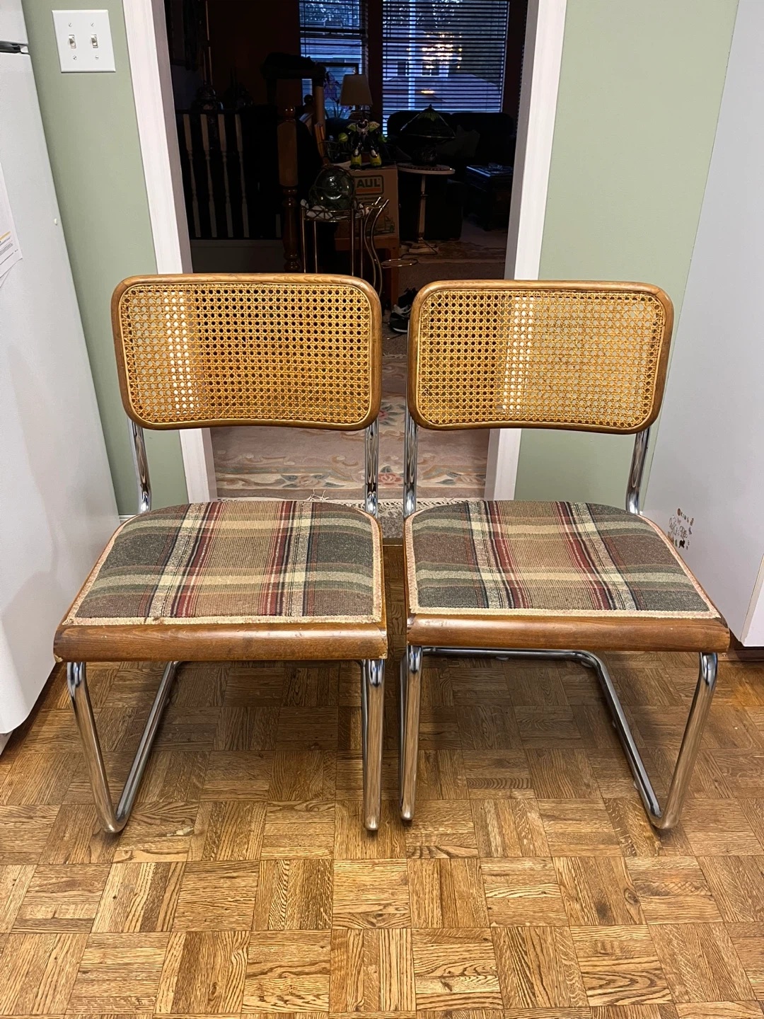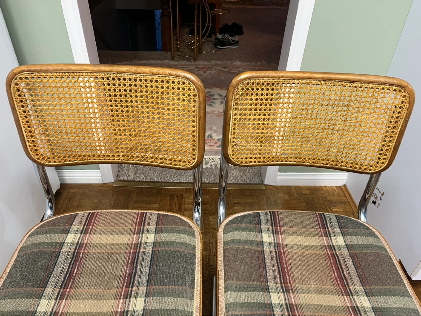 Vintage Cesca Cane Back Chairs with Plaid Upholstery - Set of 2