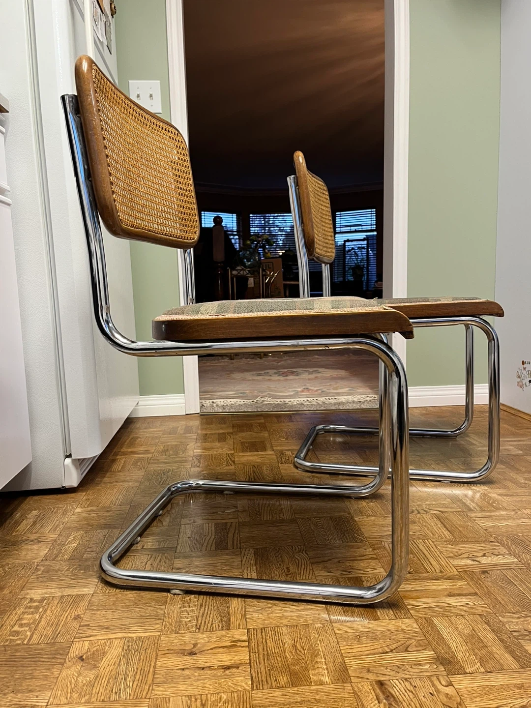 Two cantilever chairs with chrome frames, wooden accents, and cane backrests. Seats are upholstered in a classic plaid fabric. These chairs would be great for a dining set or as accent chairs in a living space.