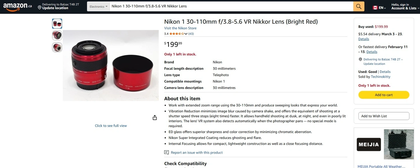 Camera Lens - Nikon 1 30-110mm f/3.8-5.6 VR Nikkor Lens