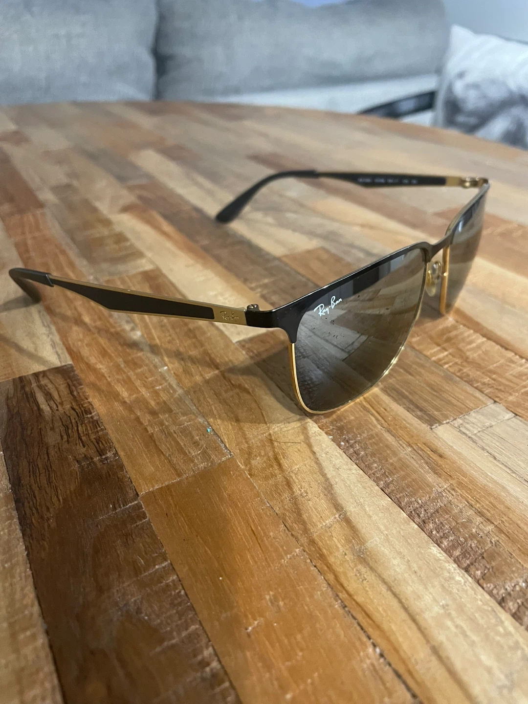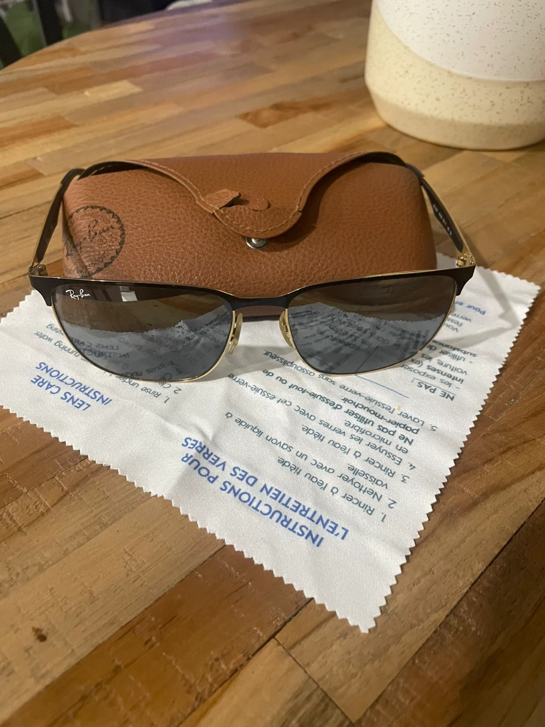 Classic Ray-Ban sunglasses with a black and gold frame. They come with their original case and lens cloth. These shades offer timeless style and good protection. Lenses are scratched
