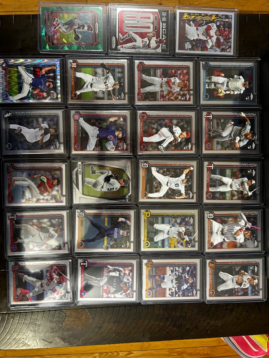 Collection of various baseball cards featuring players like Cam Collier, K. Keaschall, and M. Horton. Cards include different designs such as Prizm and 20-80 Scale. Most cards are in protective sleeves.