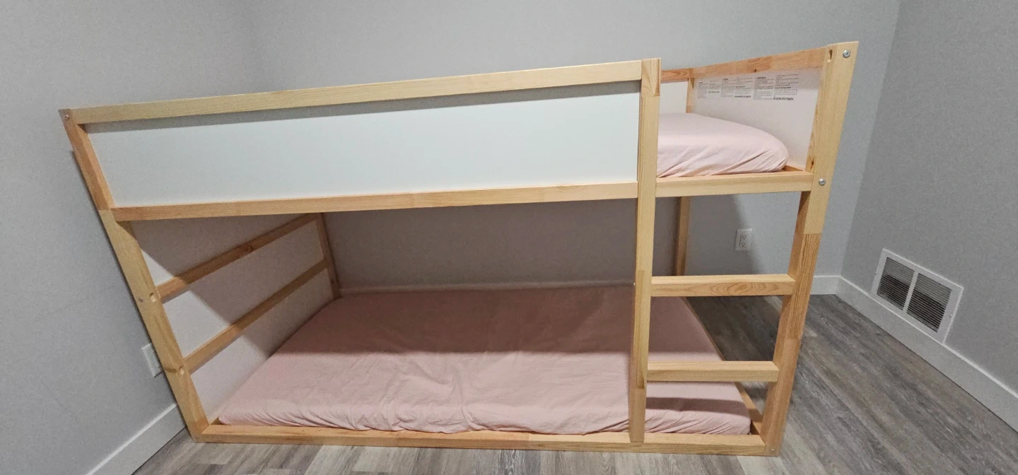 This is a wooden bunk bed frame. It features white panels for a clean look. This bed is perfect for saving space in smaller rooms or for siblings sharing a room. Comes with two mattresses.