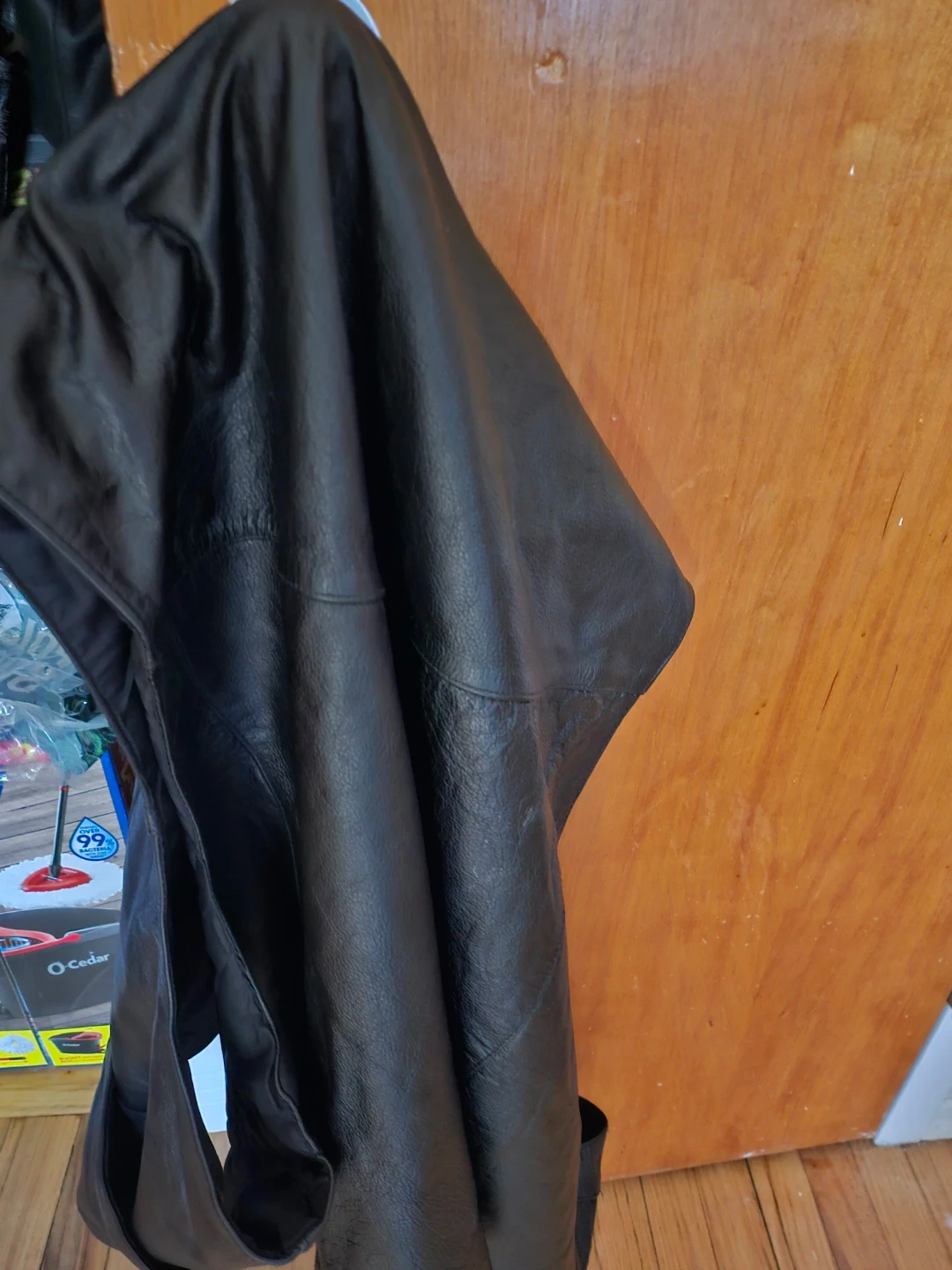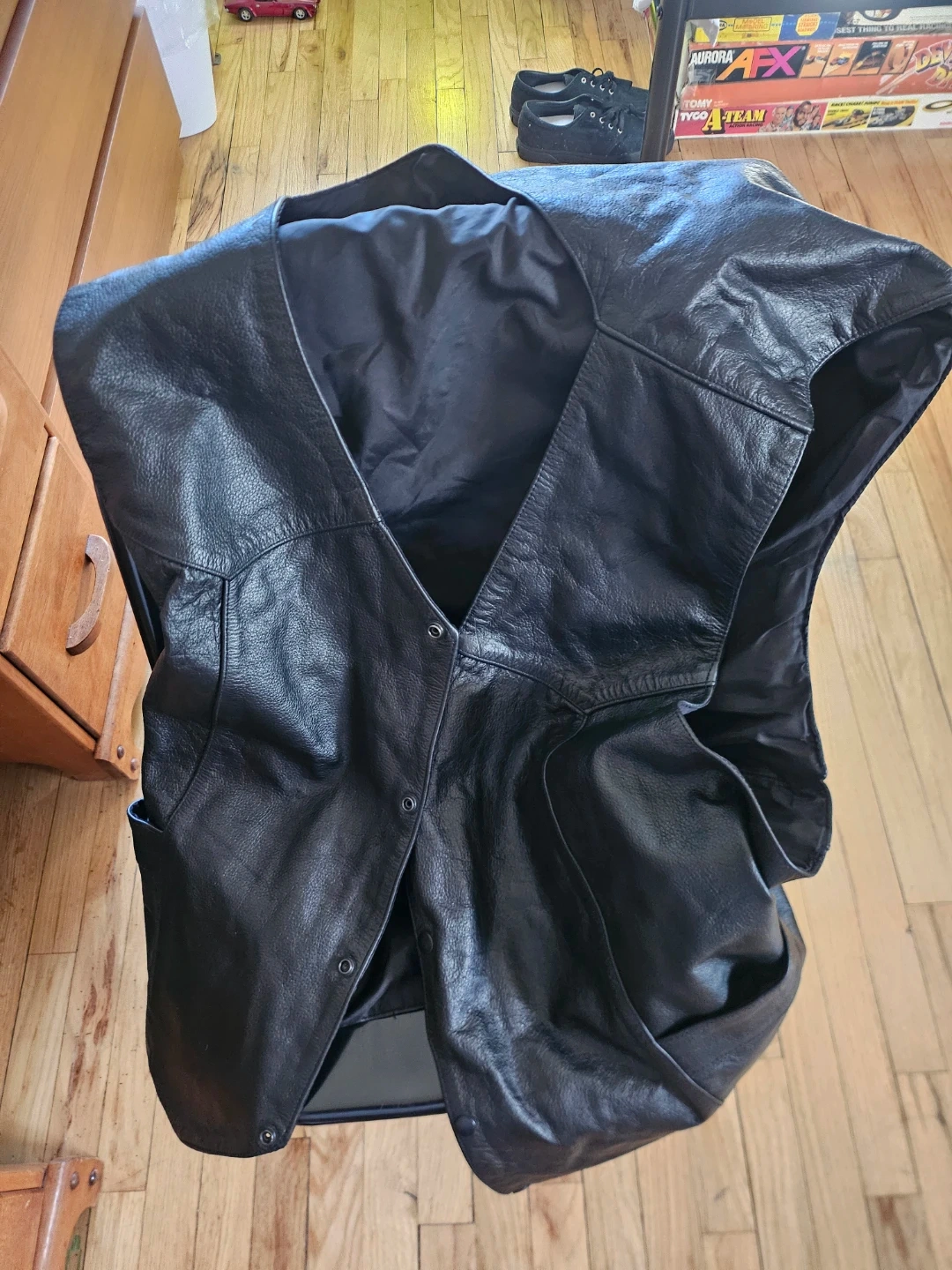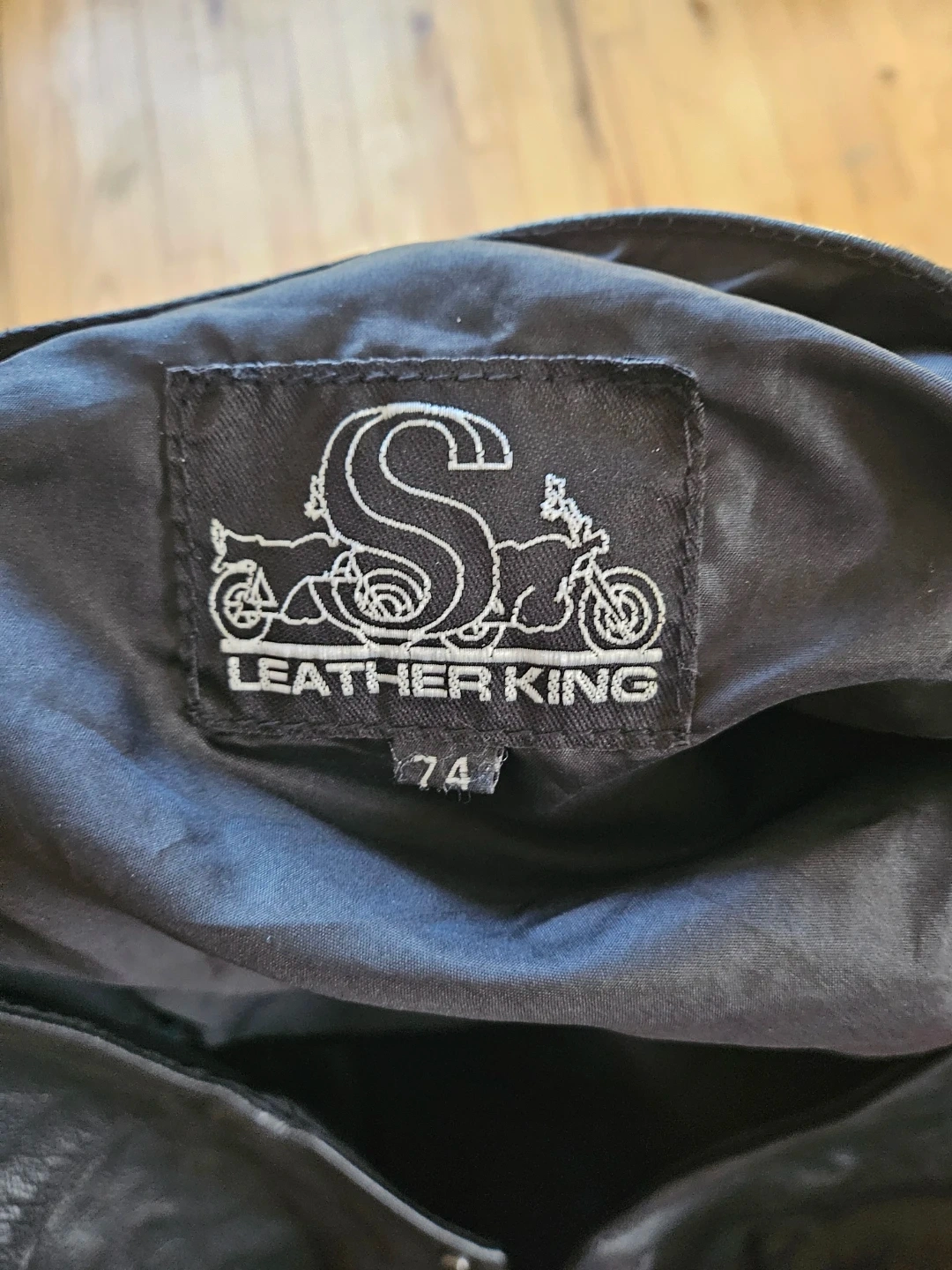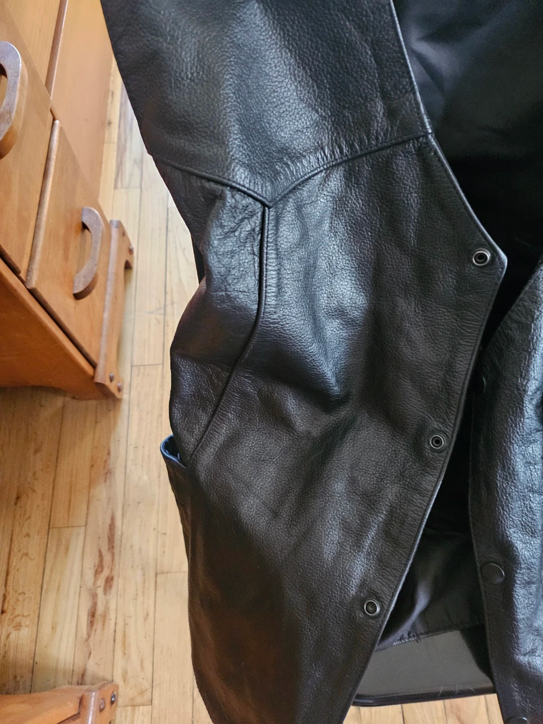 Leather King black leather Biker vest size 74 Features a snap-button front closure and two front pockets. Unlined like new 631 680-6779
