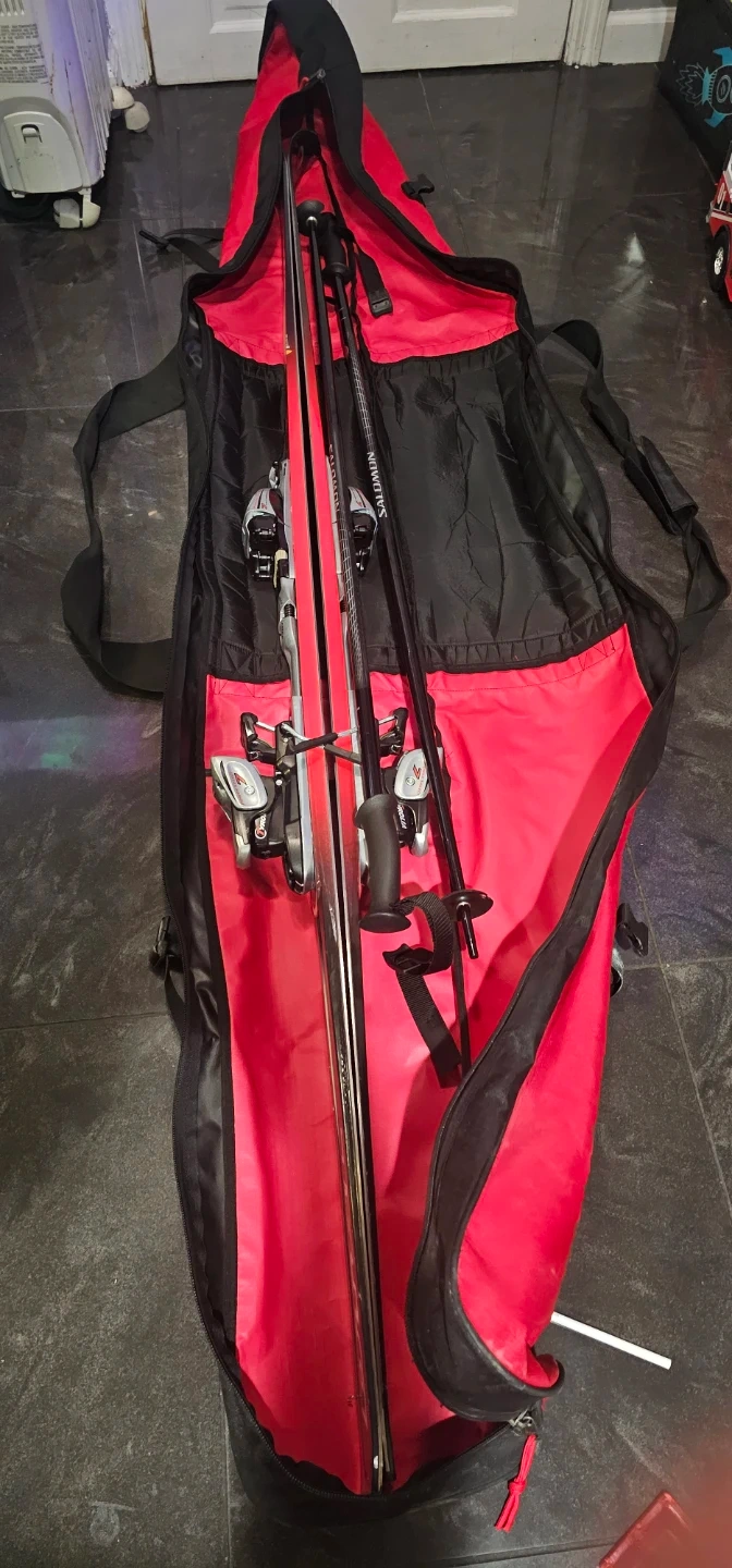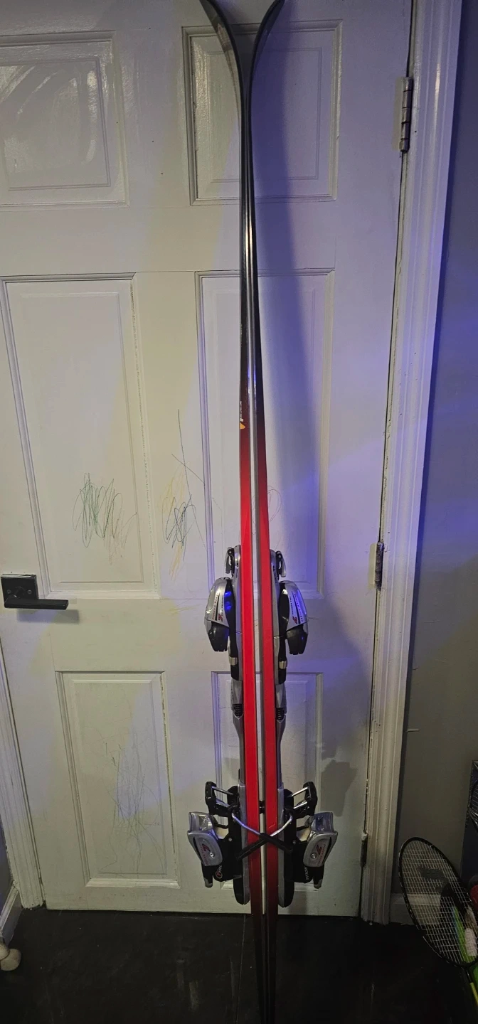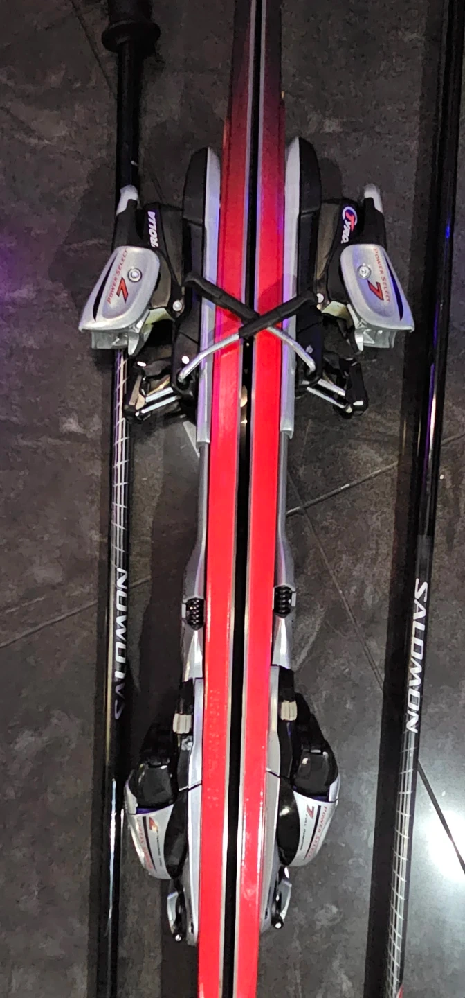 This is a set of Olin skis, red and black, with Salomon ski poles. Skis include bindings. Great for hitting the slopes!