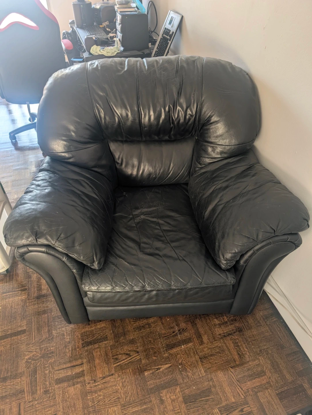 Comfortable black leather loveseat Features plush cushioning and wide armrests. Leather material. Needs two people to lift to put in van