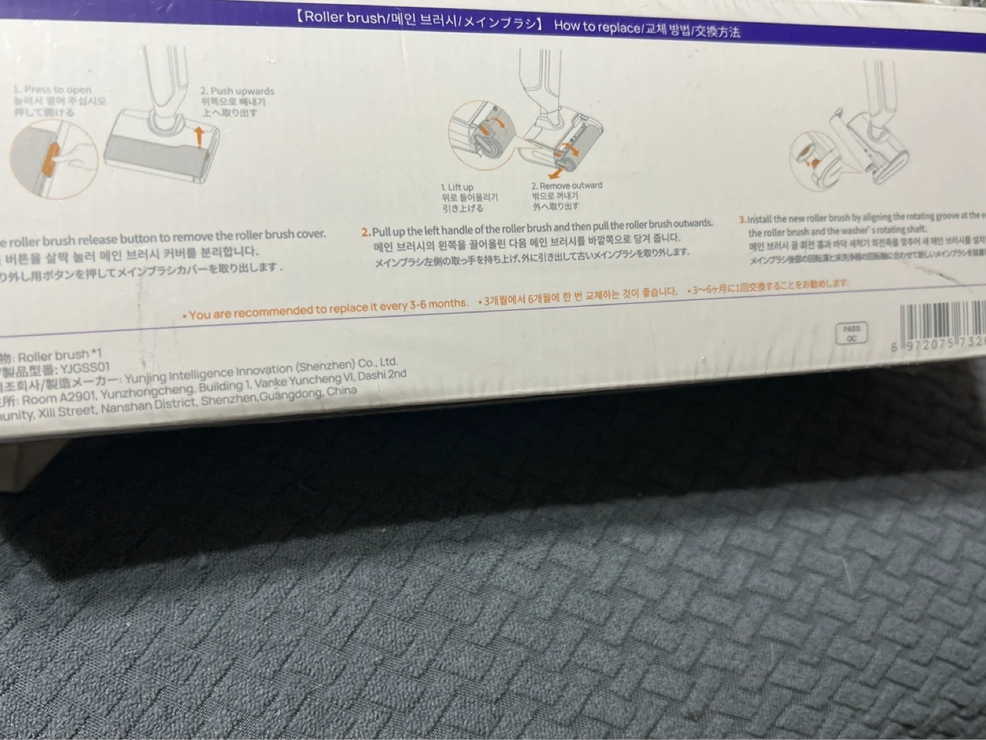 This is a new replacement roller brush for Narwal vacuum cleaners. It has a textured grey material with purple stripes. It's designed for effective floor cleaning.still in original package.