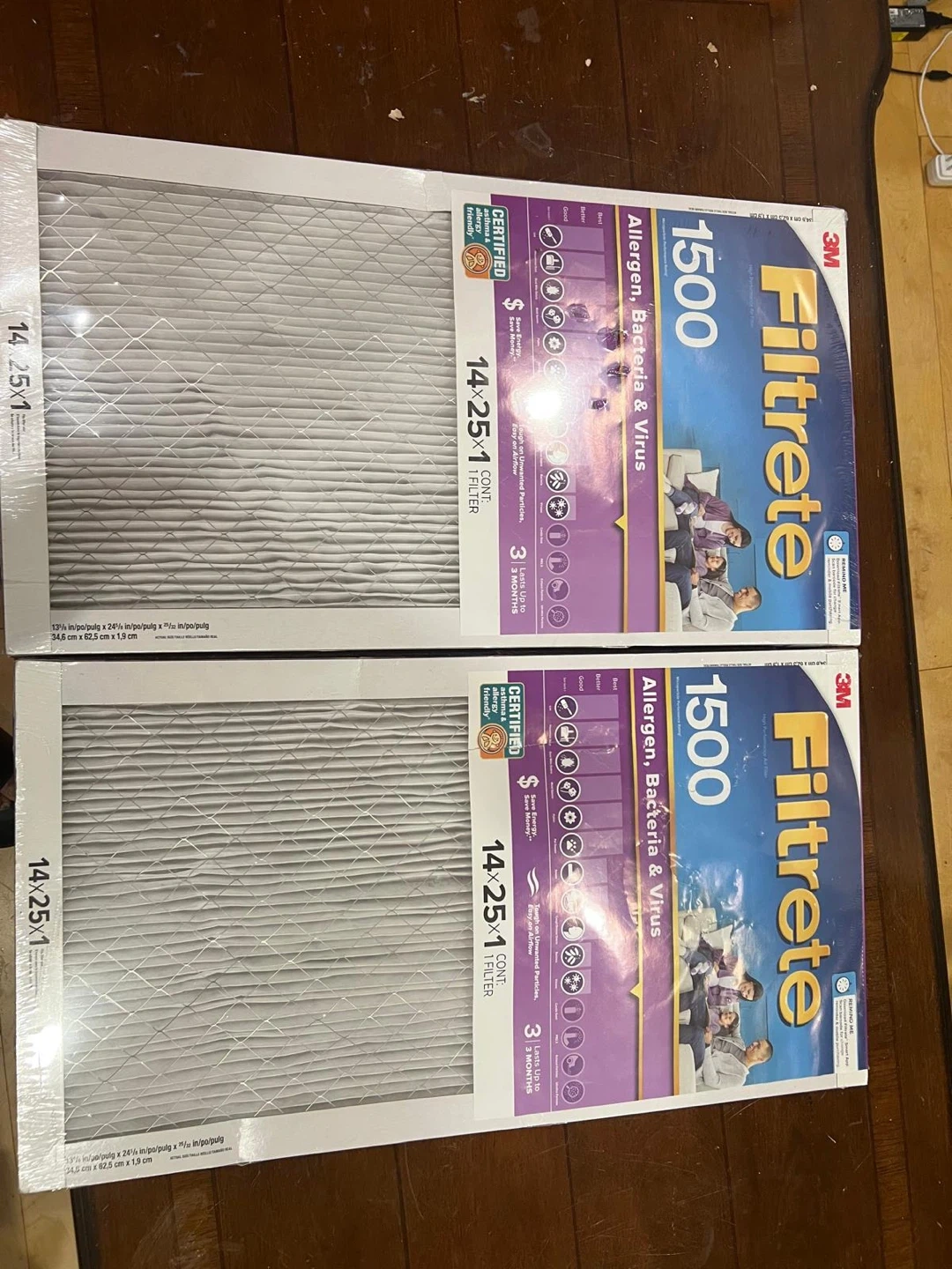 107Selling a brand new 3M Filtrete 1500 air filter! It's size 14x25x1 and is designed to capture allergens, bacteria, and viruses. It's certified asthma and allergy friendly, and is tough on unwanted particles while being easy on airflow. Each filter lasts up to 3 months.