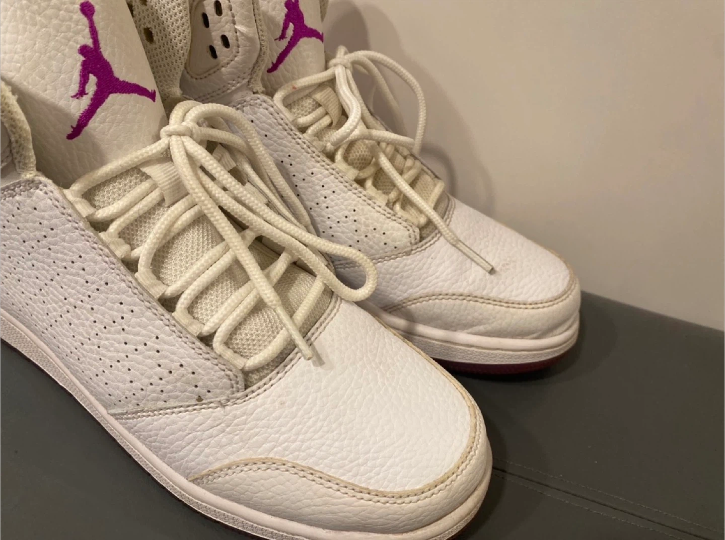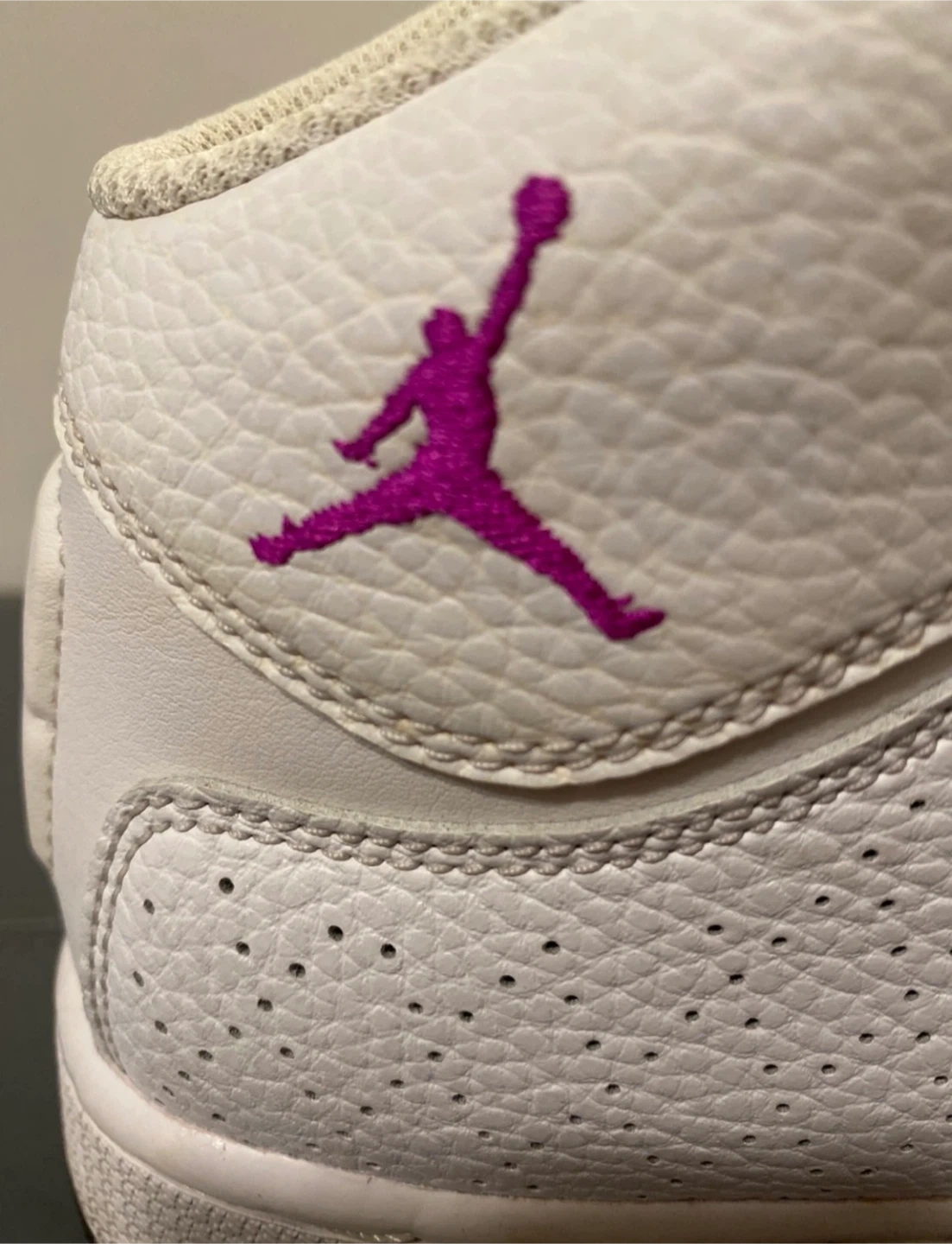 These are Jordan Air 1 High OG sneakers in white with purple accents. Size 6.5 Youth (US). Made in Vietnam. Excellent for everyday wear or casual sports!