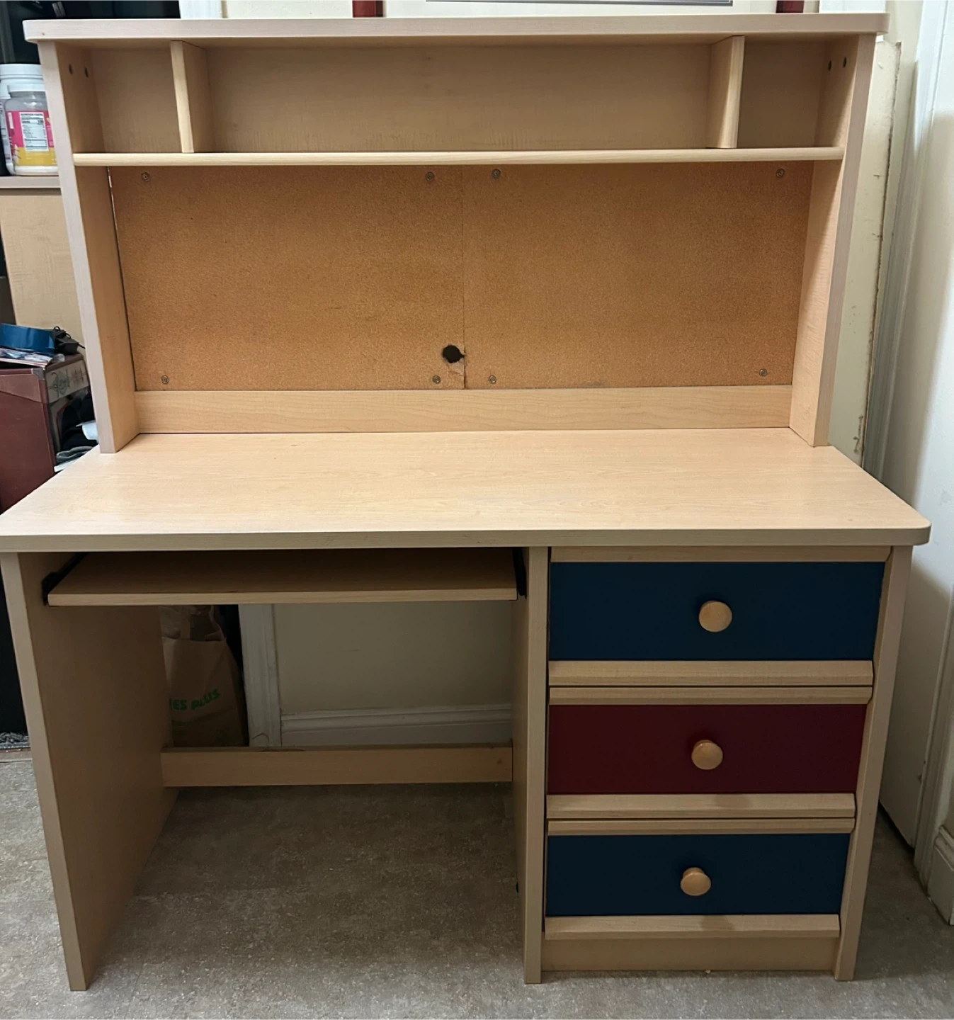 This light wood desk features a hutch with open shelving. It has a pull-out keyboard tray and three drawers with blue and red fronts. The drawer pulls are natural wood knobs.