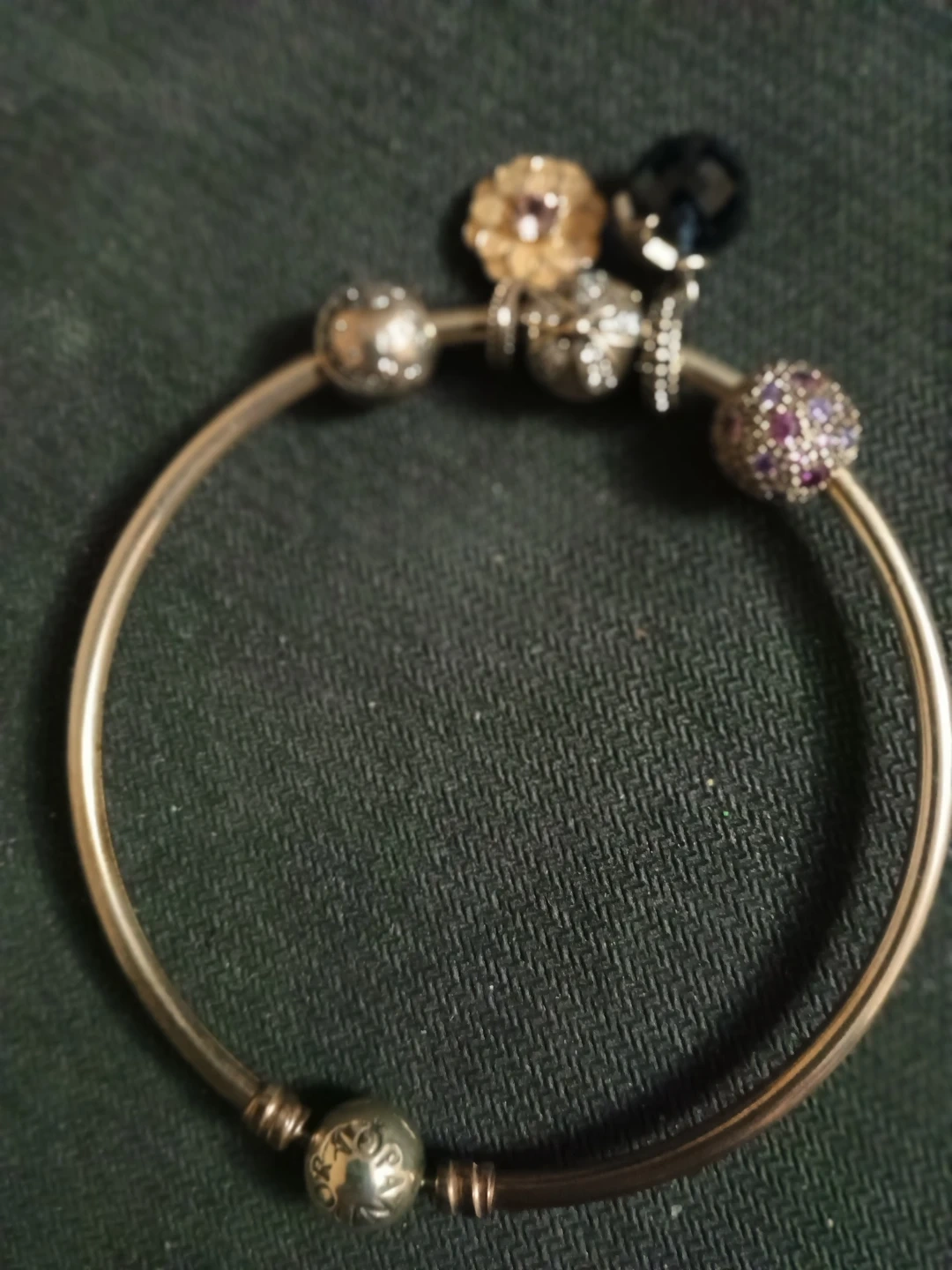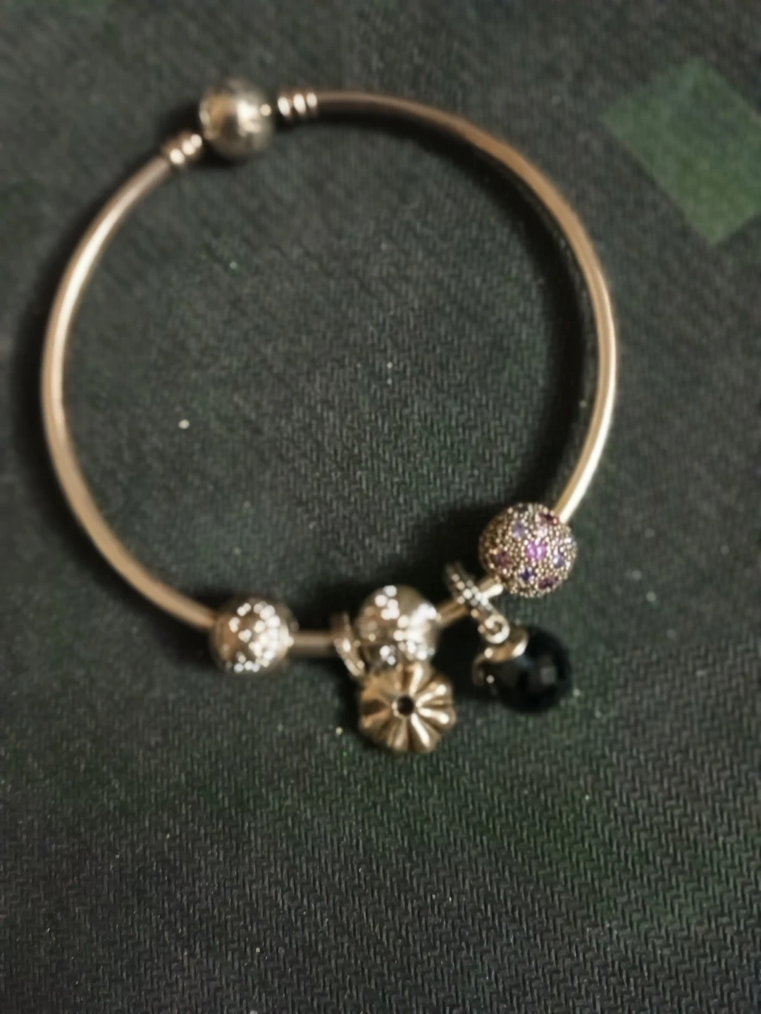 This is a Pandora sterling silver bangle bracelet. It comes with several charms, including a pavé charm with purple stones and a black bead charm. It's presented in its original Pandora box. Perfect for adding a personal touch to your look!