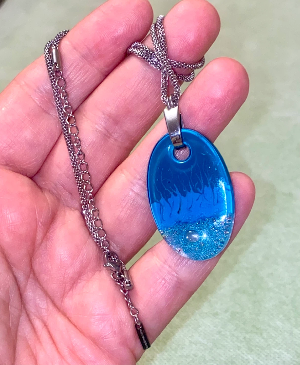Beautiful blue glass pendant with an ocean wave design. Sterling silver chain. Pendant is oval-shaped and features a vibrant blue with textured "water" and bubble accents. The chain measures approximately 17 inches long.