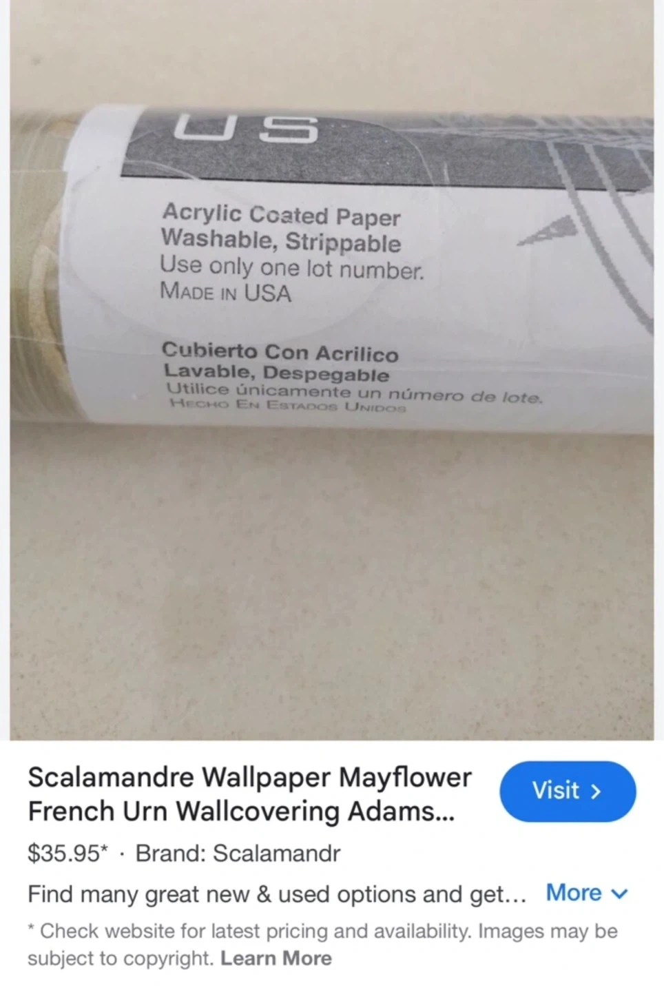 Acrylic coated paper wallpaper. It's washable and strippable. Made in USA. Roll size is 52.1 cm x 10.0 m, covering 5.2 m².