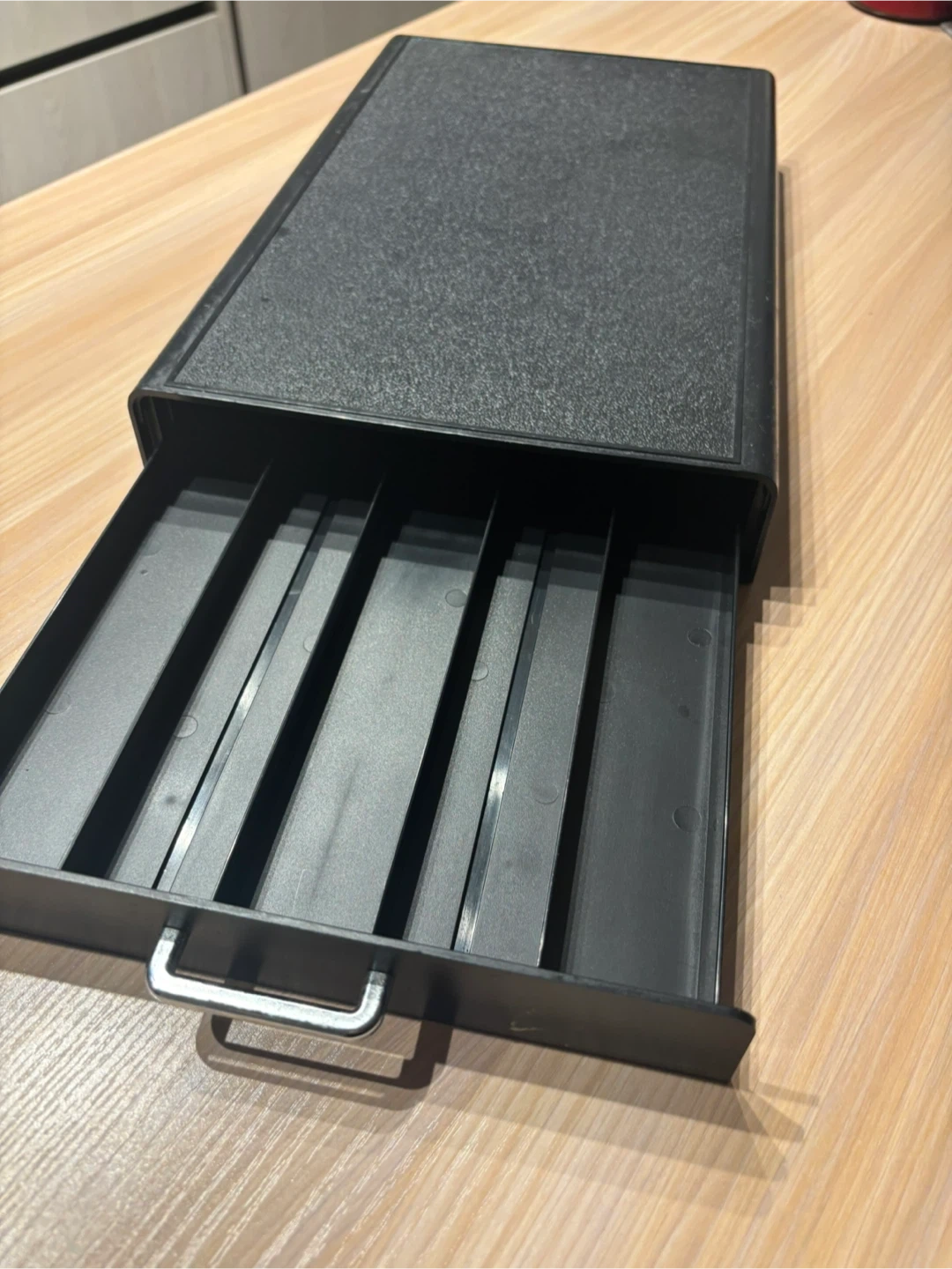 This is a black drawer organizer with five slots. It's great for keeping original nespresso coffee pods tidy in the drawer. The textured plastic design is durable and practical.