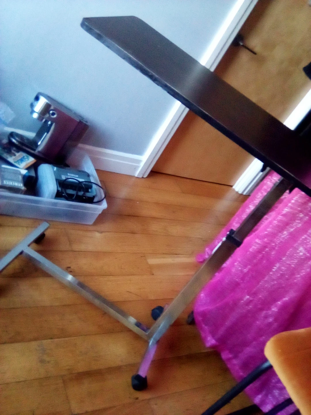 This adjustable bedside table features a dark wood-look tabletop and a metal frame with wheels. It's perfect for use next to a bed or couch. The height is adjustable for your convenience! It's not in perfect condition but it's still in good use