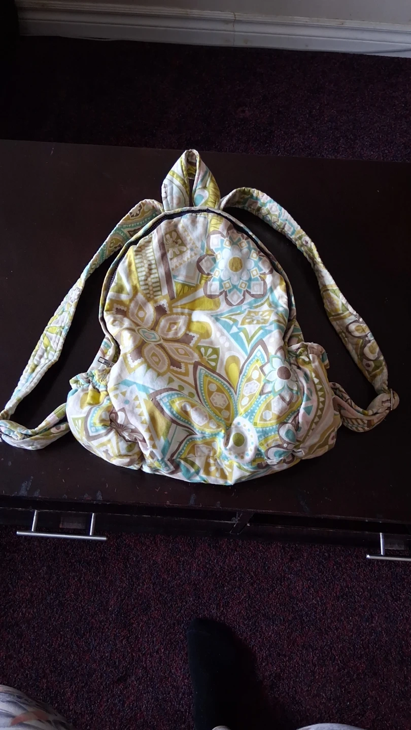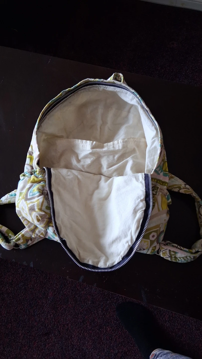 This backpack has a fun, retro-inspired pattern, made with cloth. It's a great size for everyday use or short trips. The interior is also lined with a light-coloured fabric. It is a smaller size for a younger person or for a lighter way to carry things on a day trip.