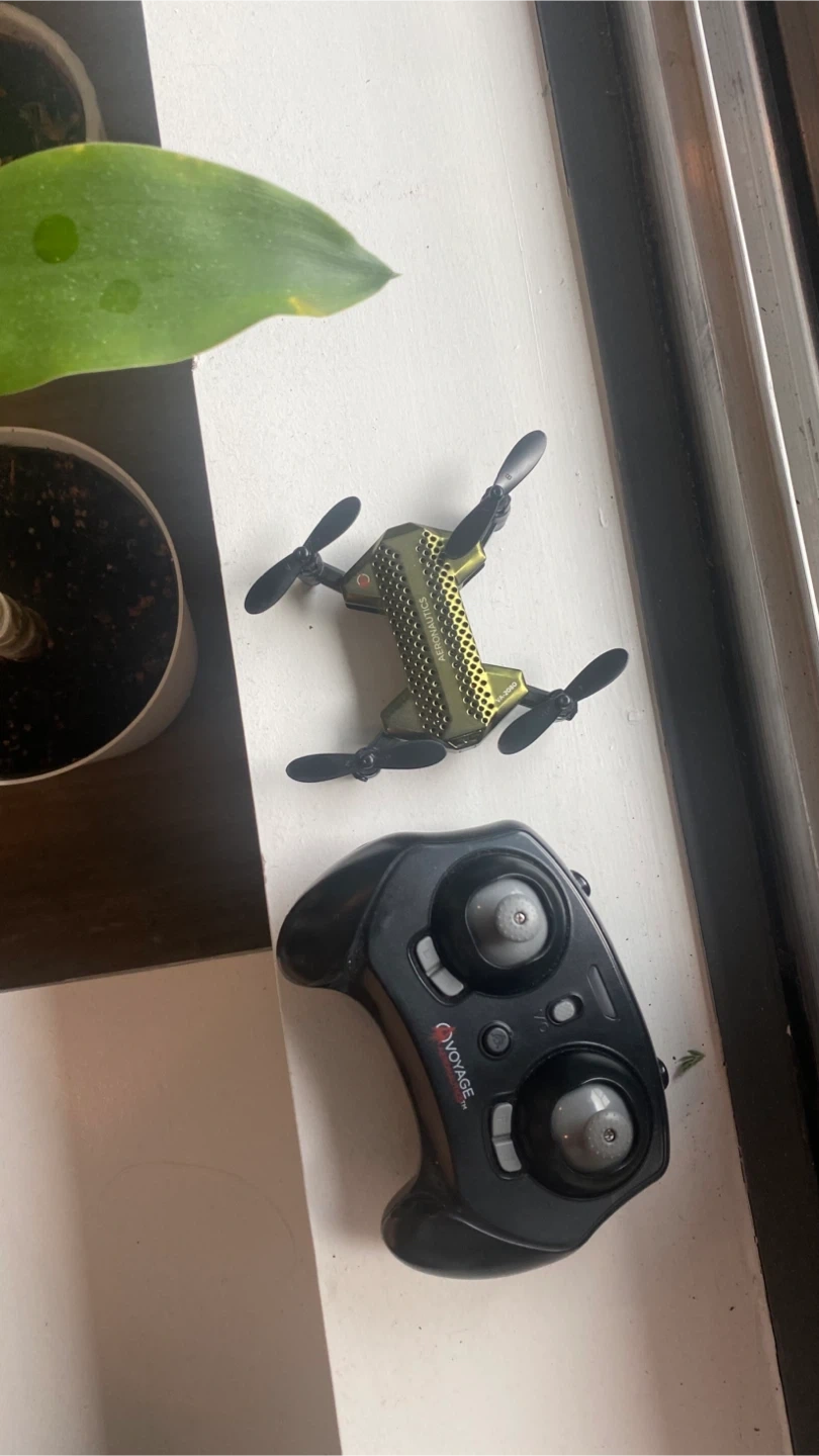 This is a Aeronauticas mini drone with its remote controller. It's green and has a compact design. It's ready for some aerial fun and practice.