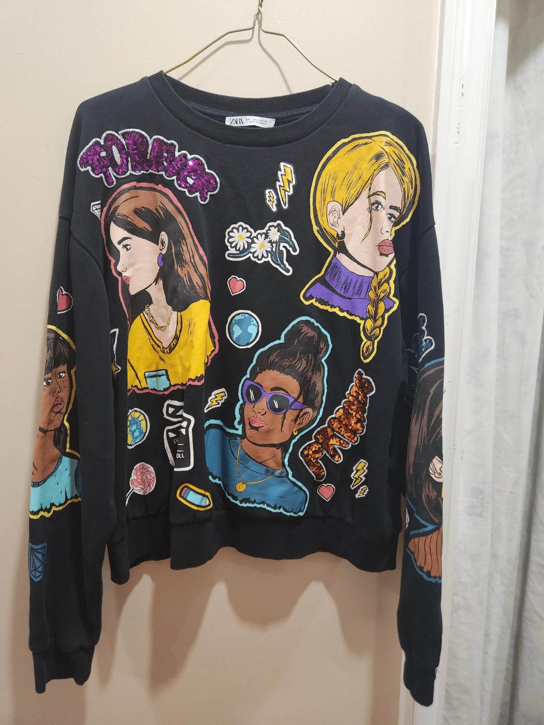 Black cropped sweatshirt. Features colourful graphic designs of women's faces and other pop art elements. Crew neck, long sleeves. Excellent for casual wear.
