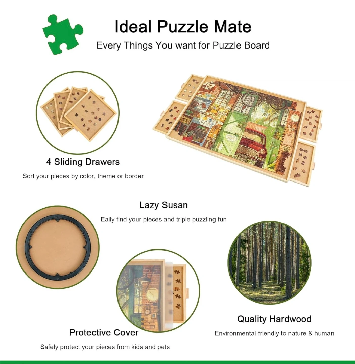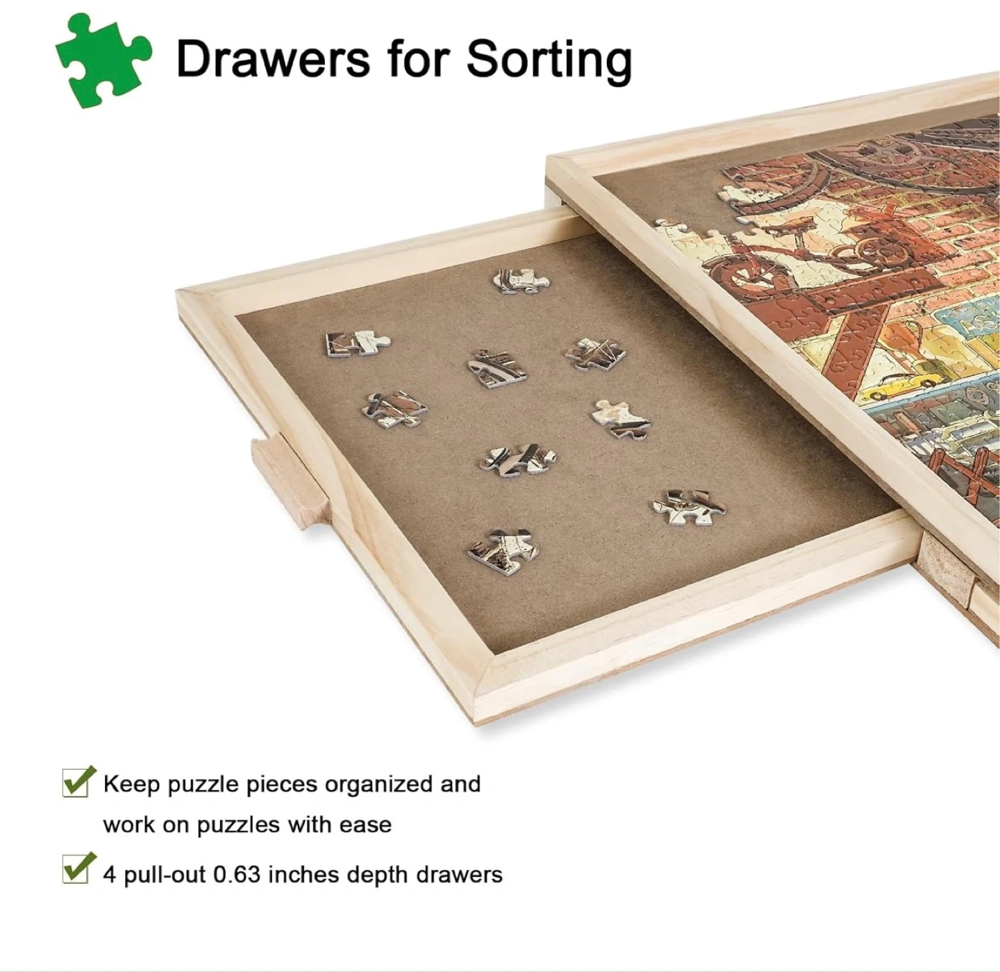 S This puzzle board is made of quality hardwood and measures 34.25 x 25.20 inches, fitting up to 1500 pieces. It features 4 pull-out drawers for sorting your puzzle pieces. A transparent protective cover is also included to keep pieces safe from dust and scratches.