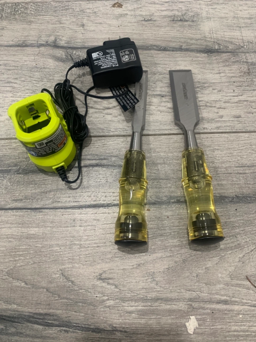 Two chisels with yellow handles and a Ryobi battery charger. These chisels are for woodworking. The charger is used for Ryobi 18V batteries.