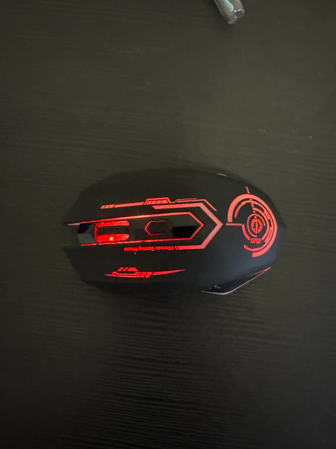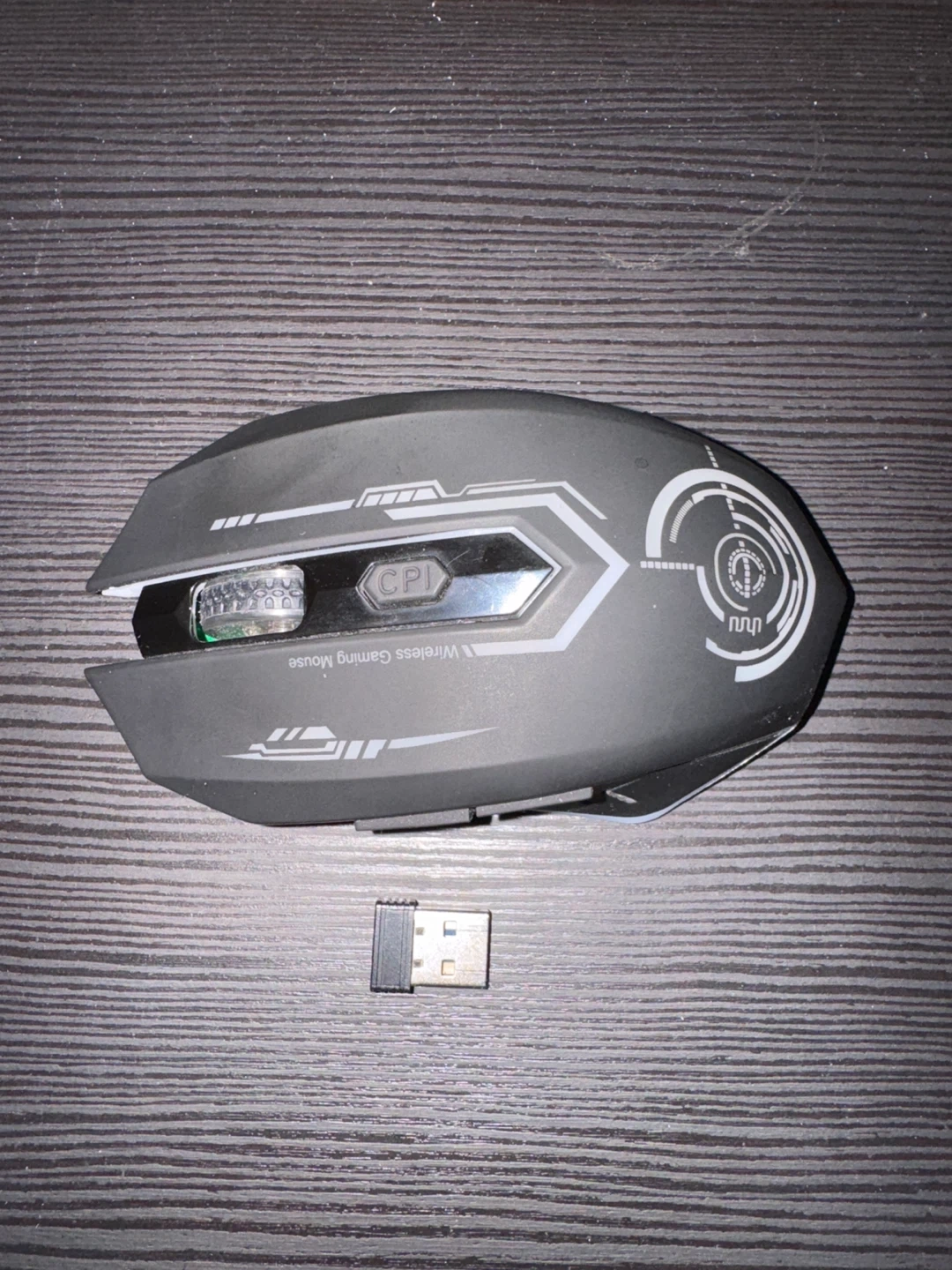 This is a wireless gaming mouse that comes with a USB receiver. It features a CPI button for adjustable sensitivity. It's a black gaming mouse.